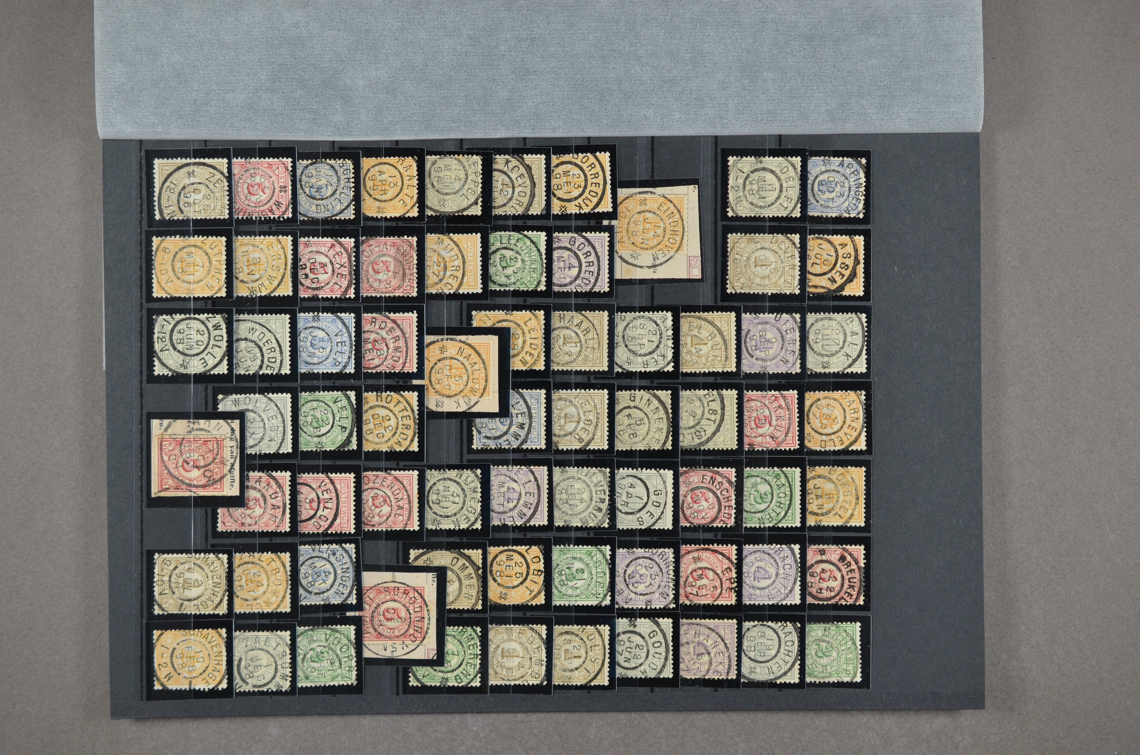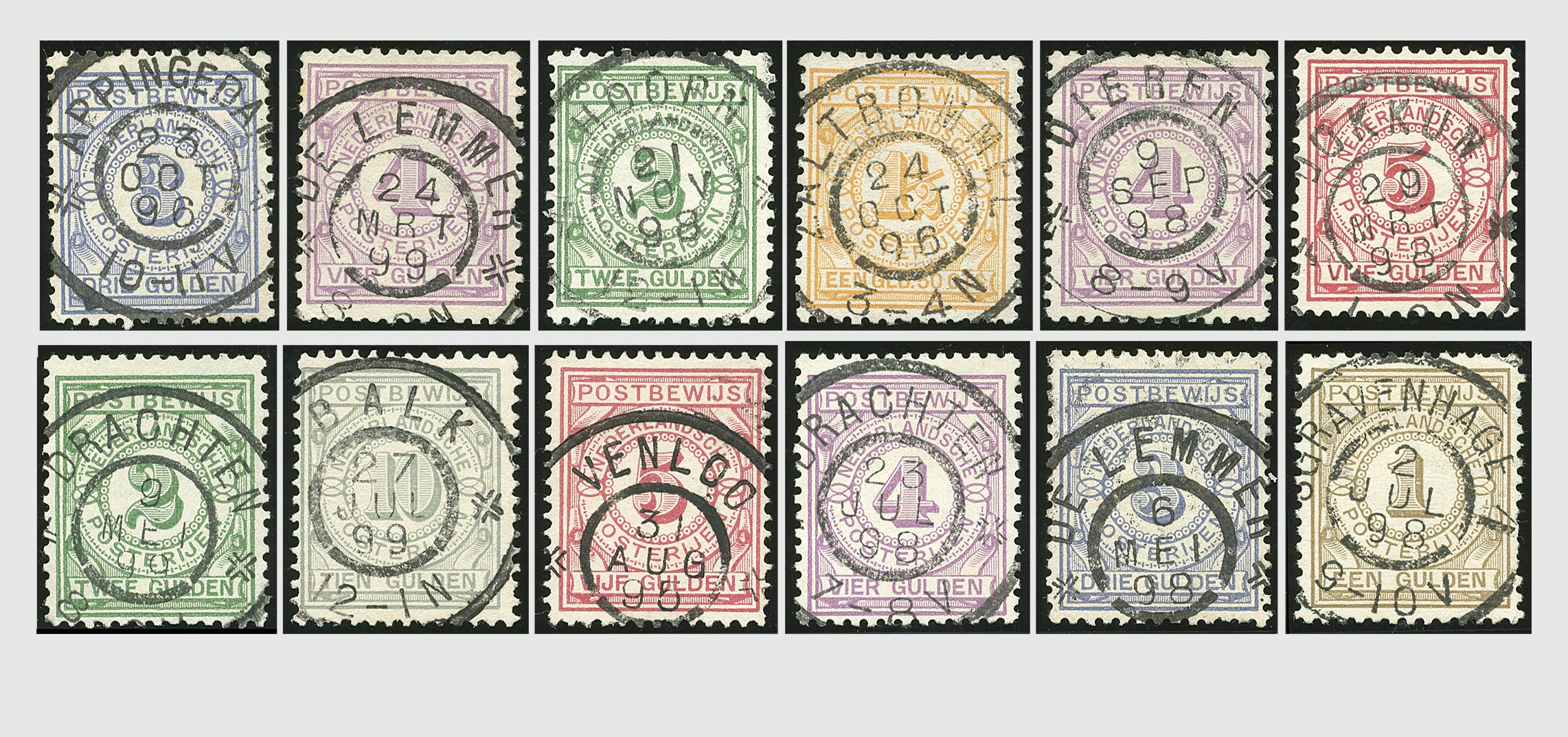GROOTRONDSTEMPELS van post- en bijpostkantoren op 78 Postbewijszegels van verschillende waarden, in uitgezochte stempelkwaliteit van zo volledig mogelijke en rechtopstaande afdrukken. Schaars!