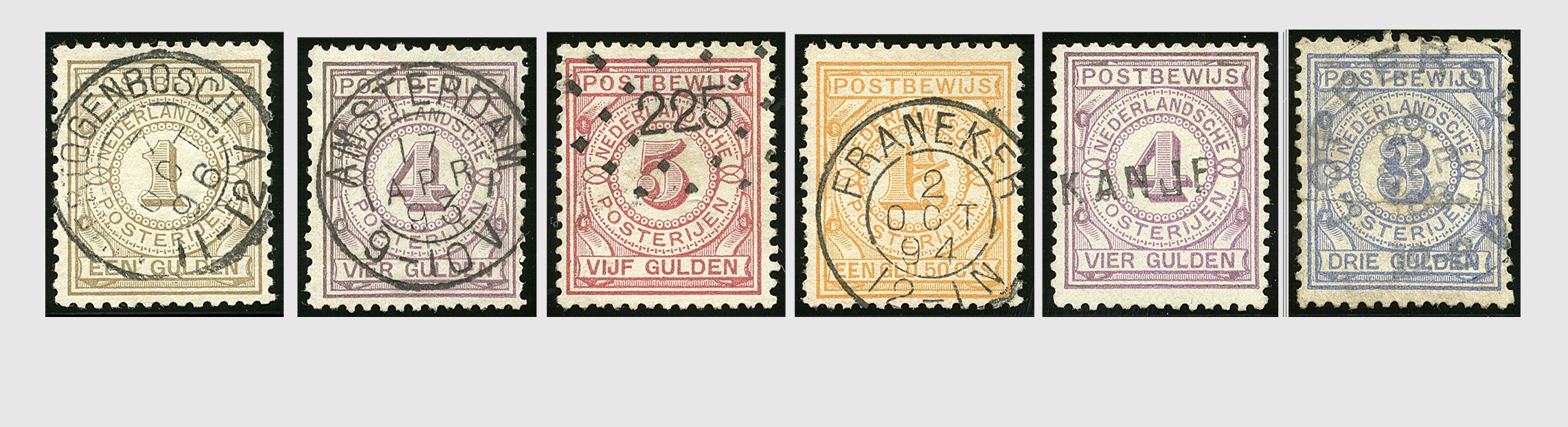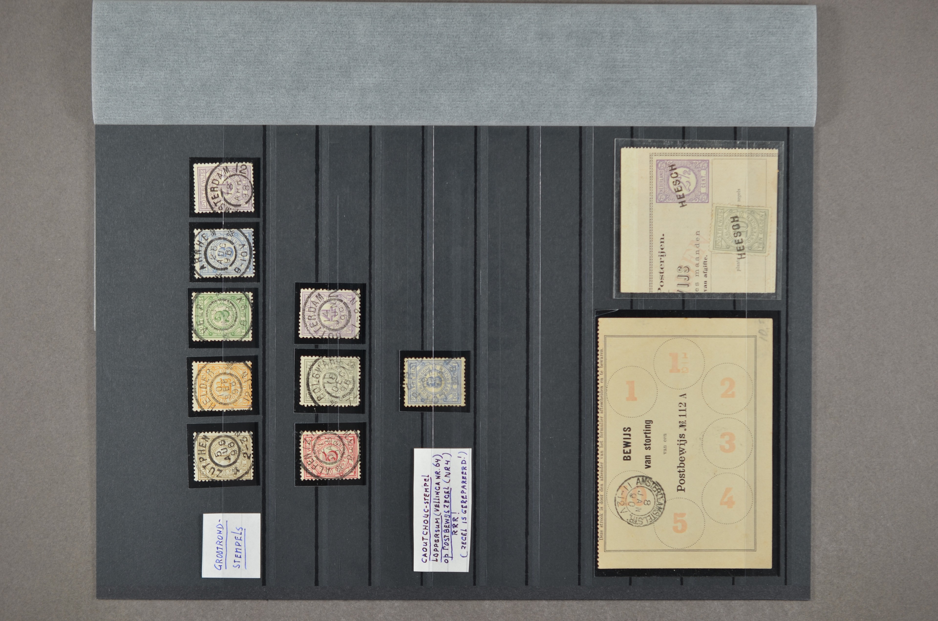 POSTBEWIJS, diverse stempels op de verschillende waarden in prachtkwaliteit: naam (w.o. Ankeveen op 5 gld, Heesch op 10 gld op postbewijsfragment, Hoek van Holland op 2 gld, Meeuwen op 10 gld, Rhoon op 5 gld, Rockanje op 3 en 4 gld, punt (36 op 1½, 186 op 1 en 225 op 1½ en 5 gld, alle zegels met gebreken), kleinrond, dubbelring (zeldzaam), grootrond en caoutchouc Loppersum (op 4 gld, gerep.). Veel schaarse tot zeer zeldzame afstempelingen!