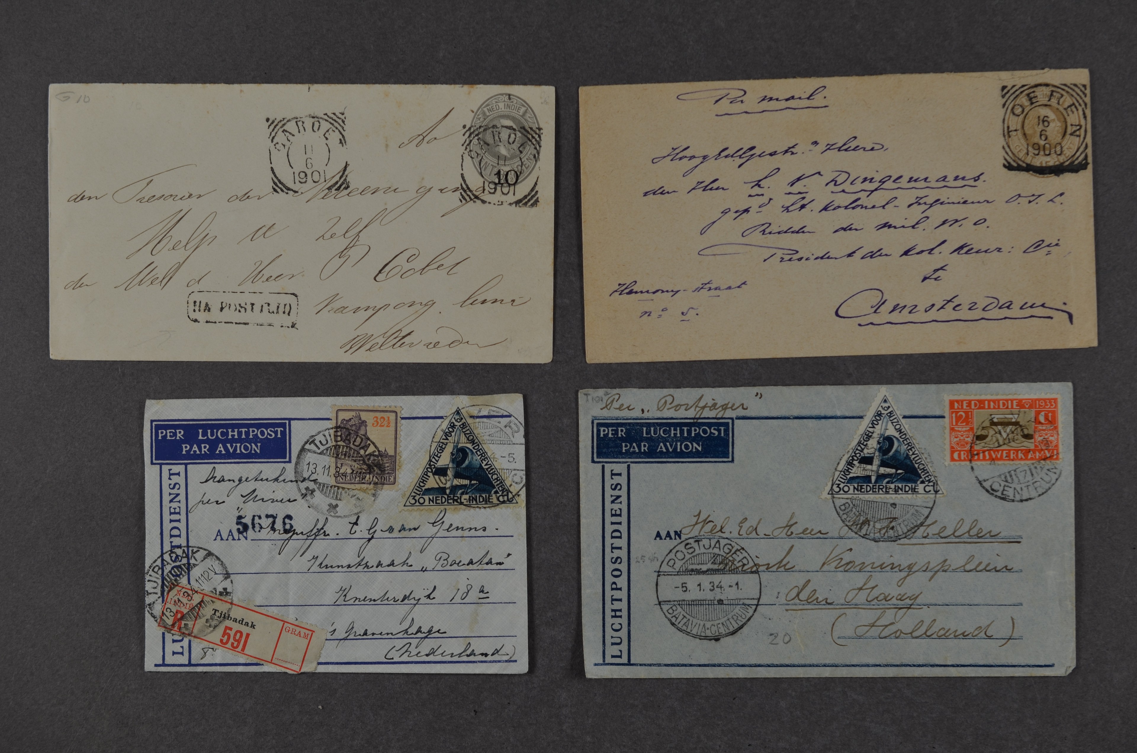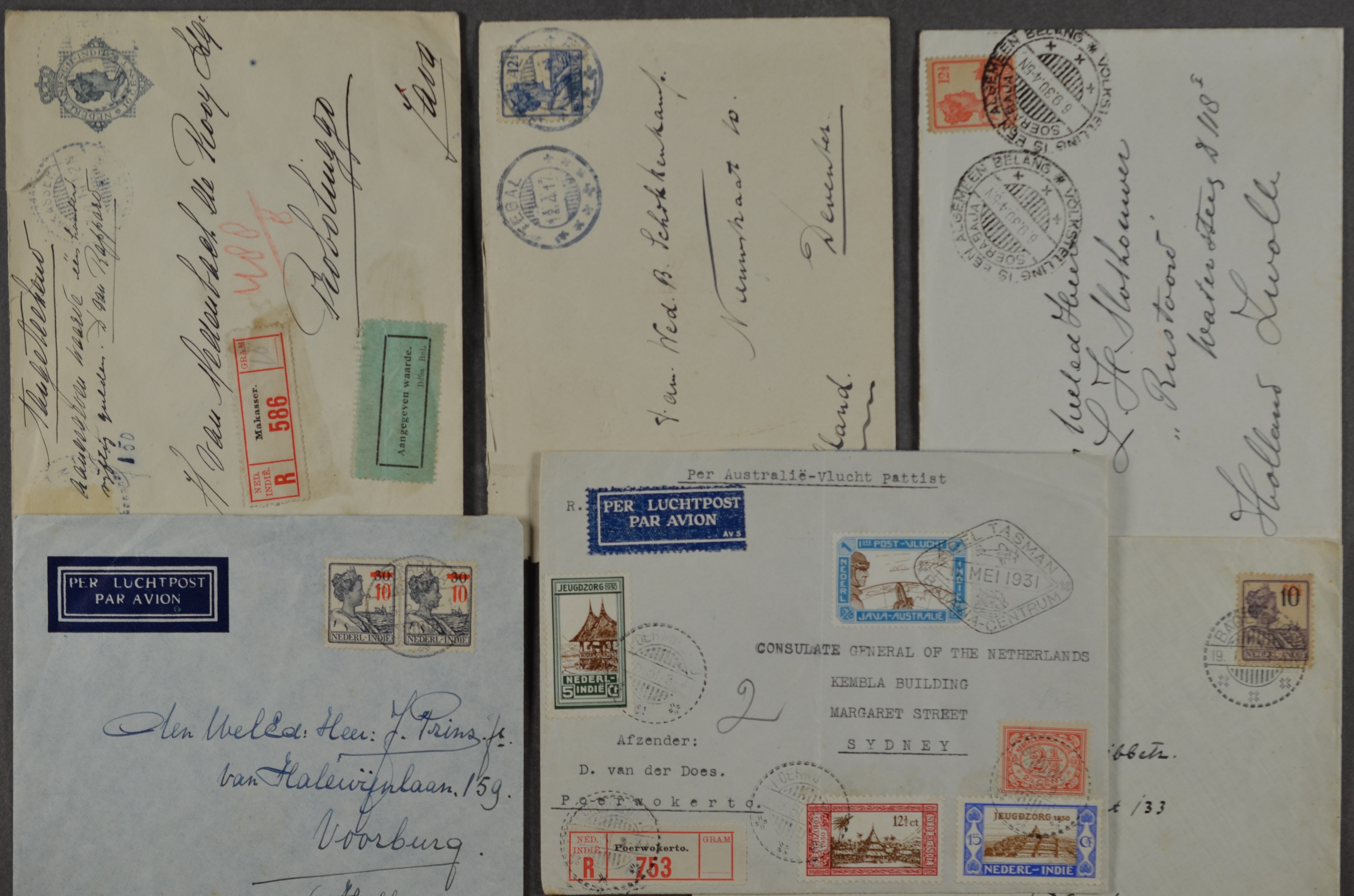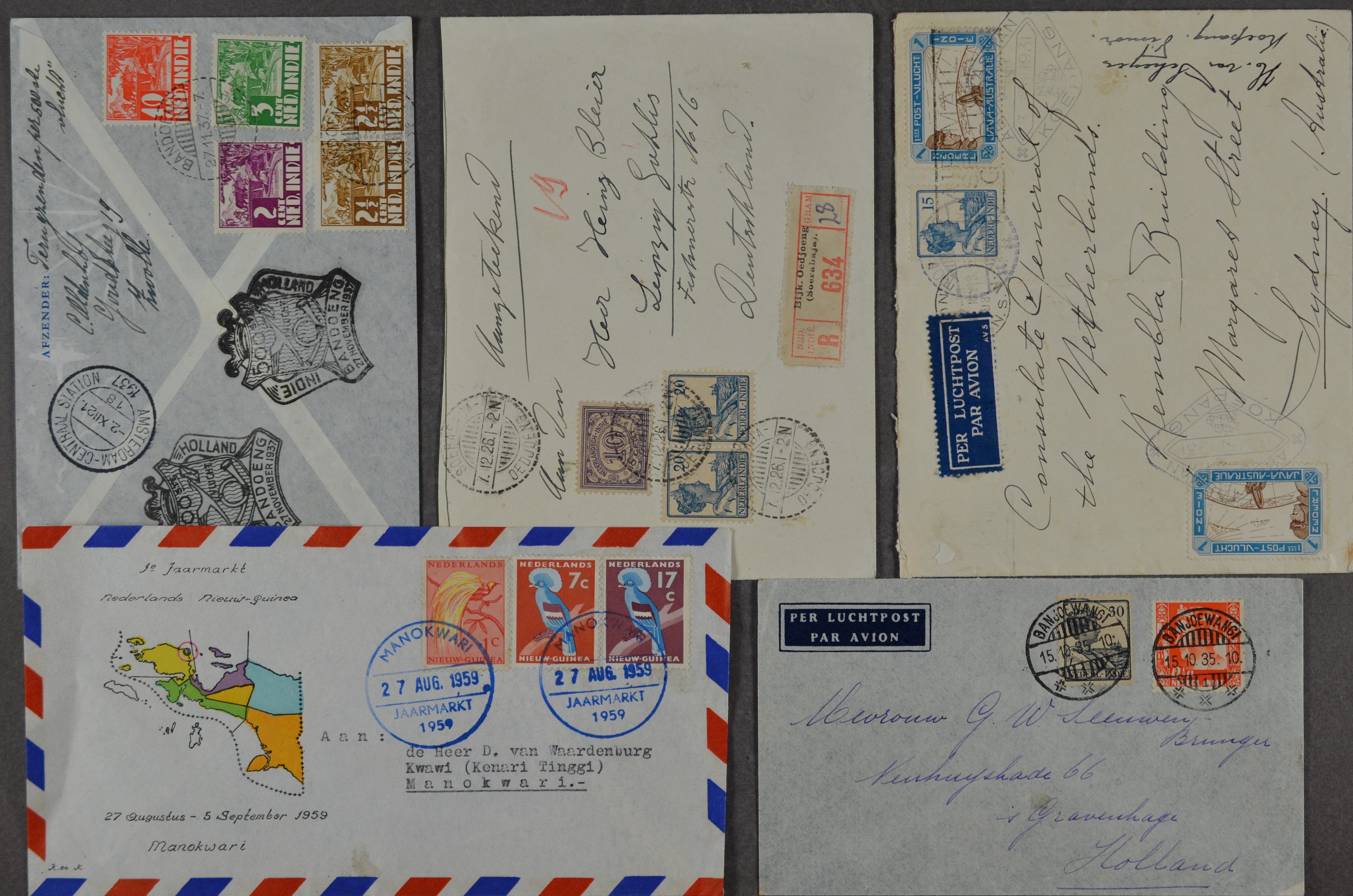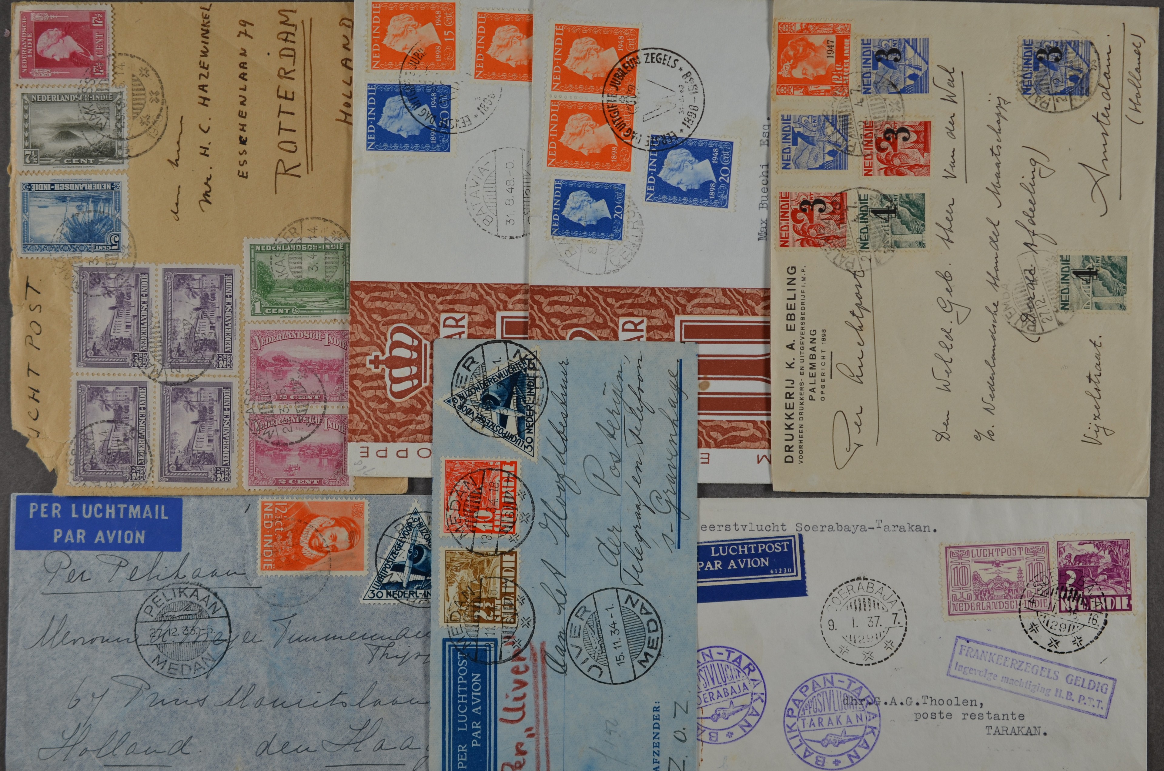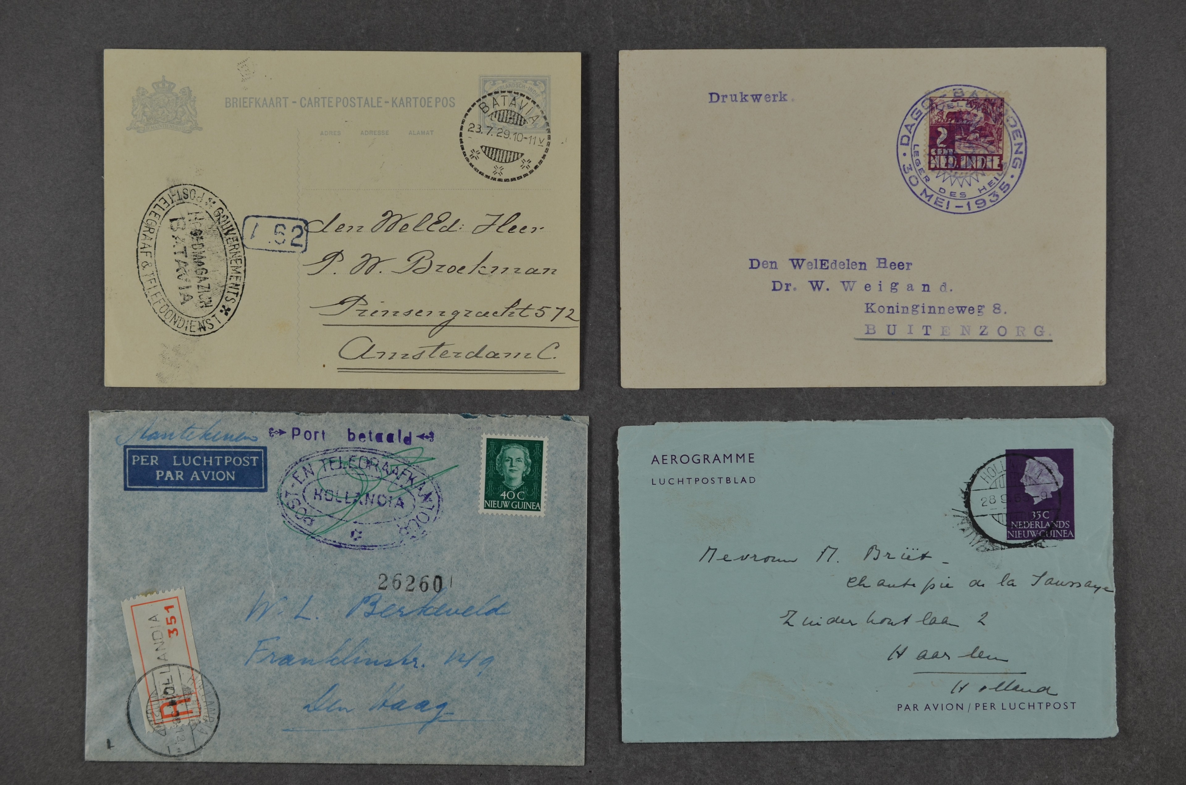 NED.- INDIË, meer dan 425 poststukken vanaf ca. 1860 w.o. met mooie frankeringen, allerlei soorten stempels incl. propaganda/gelegenheid (met iets uit Japanse bezetting), aangetekend, expresse, censuur, luchtpost, tevens iets Ned. Nieuw-Guinea w.o. 2 met Nederlandse portzegels, etc.
