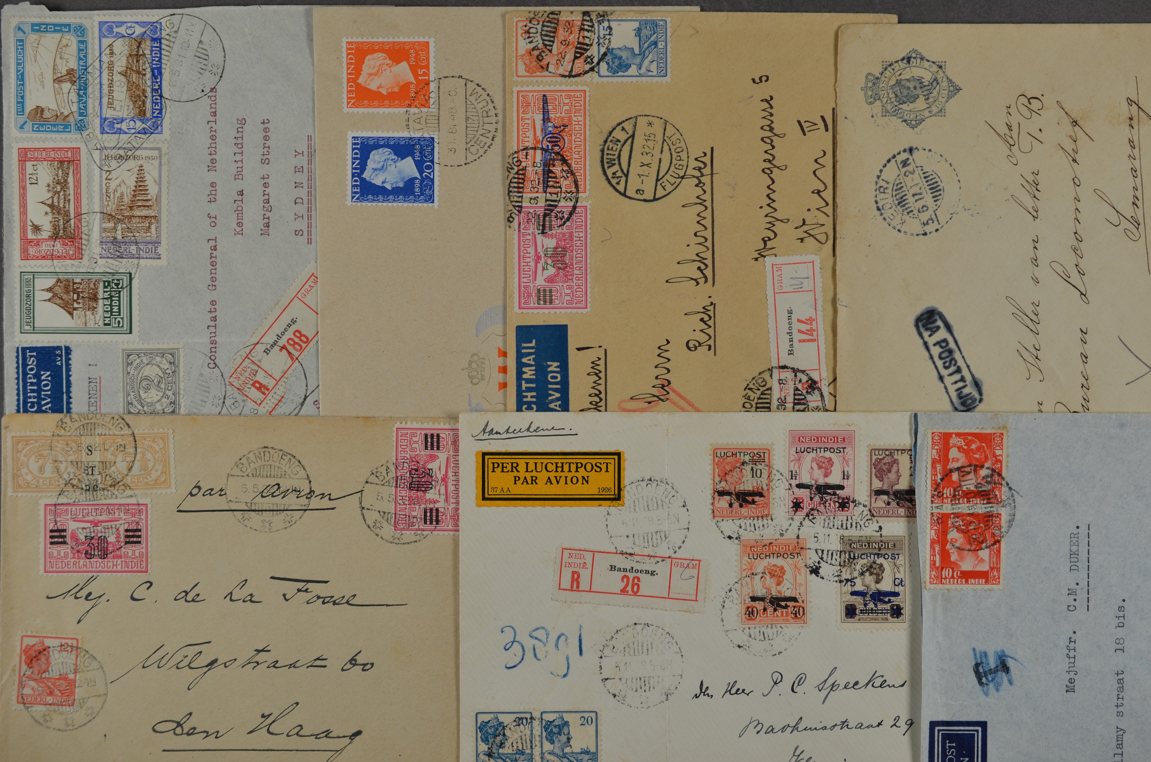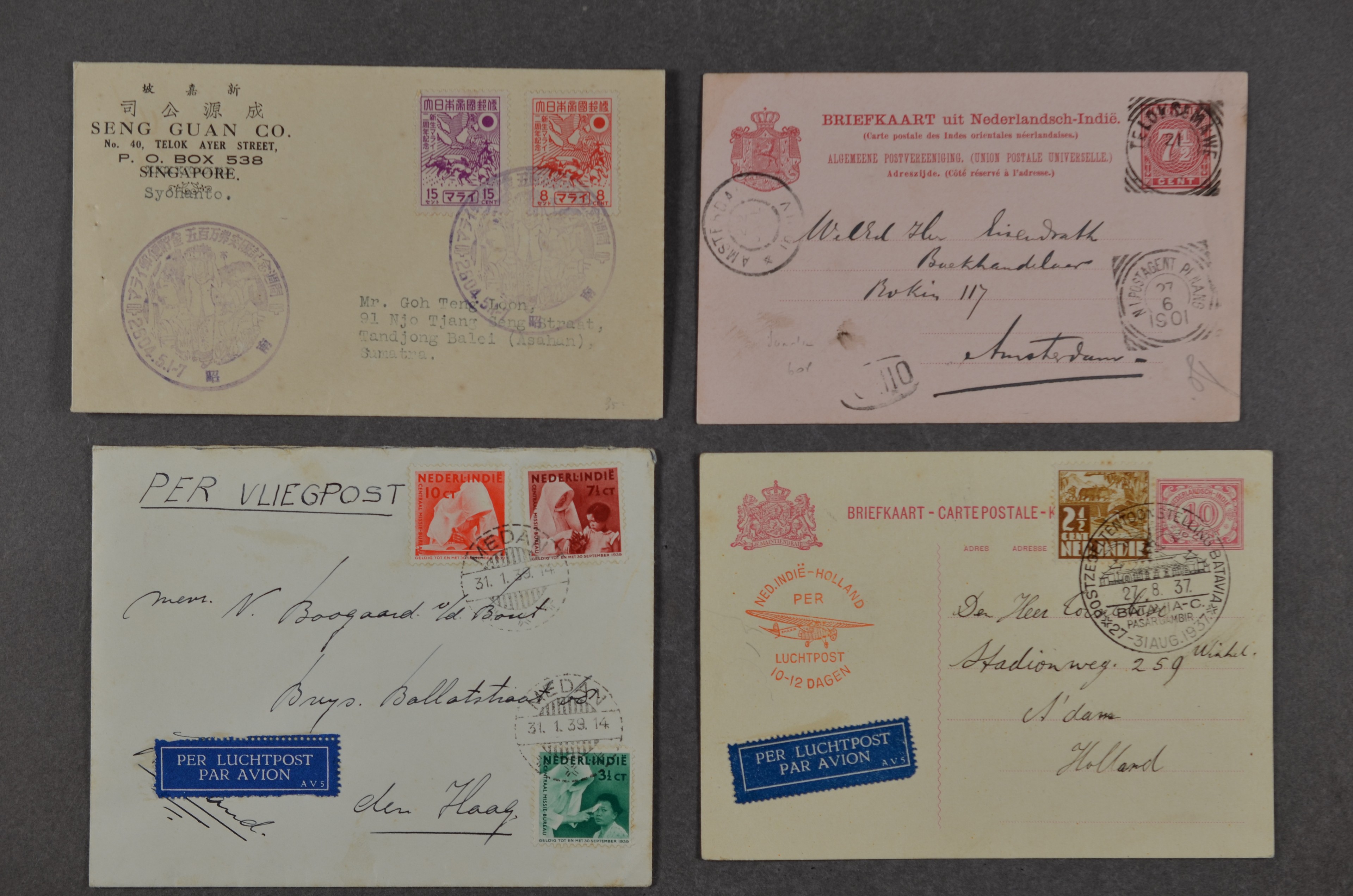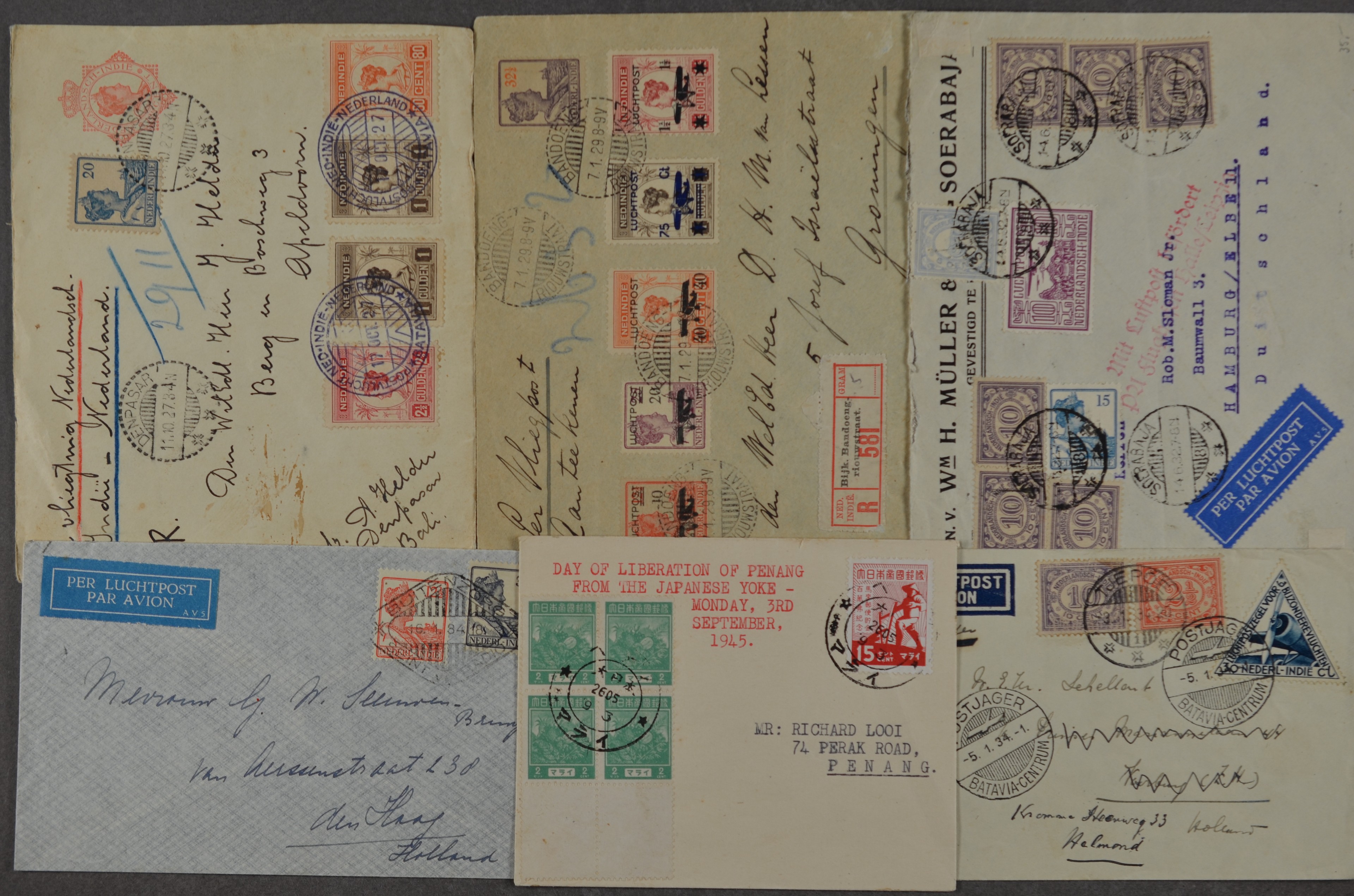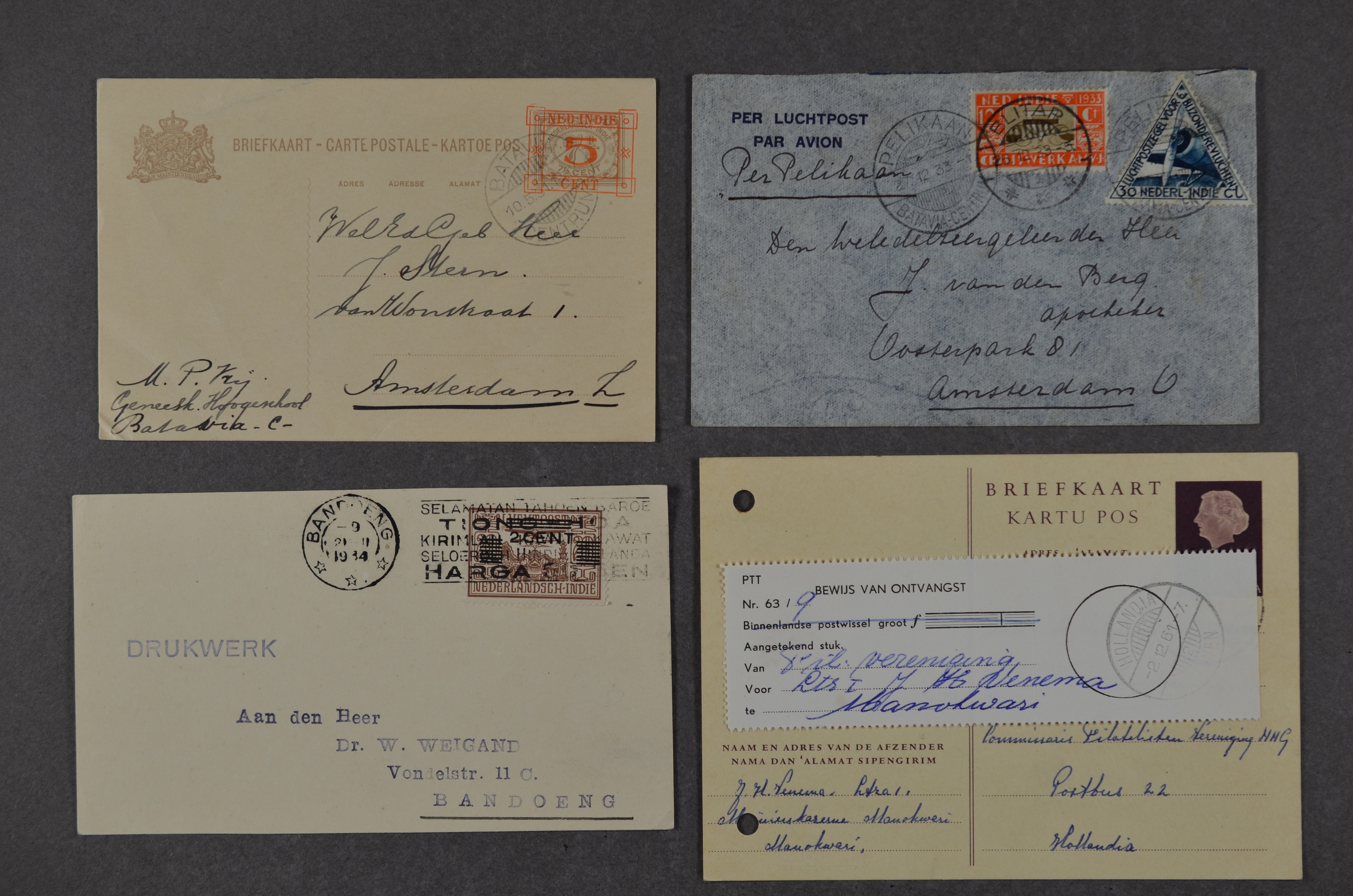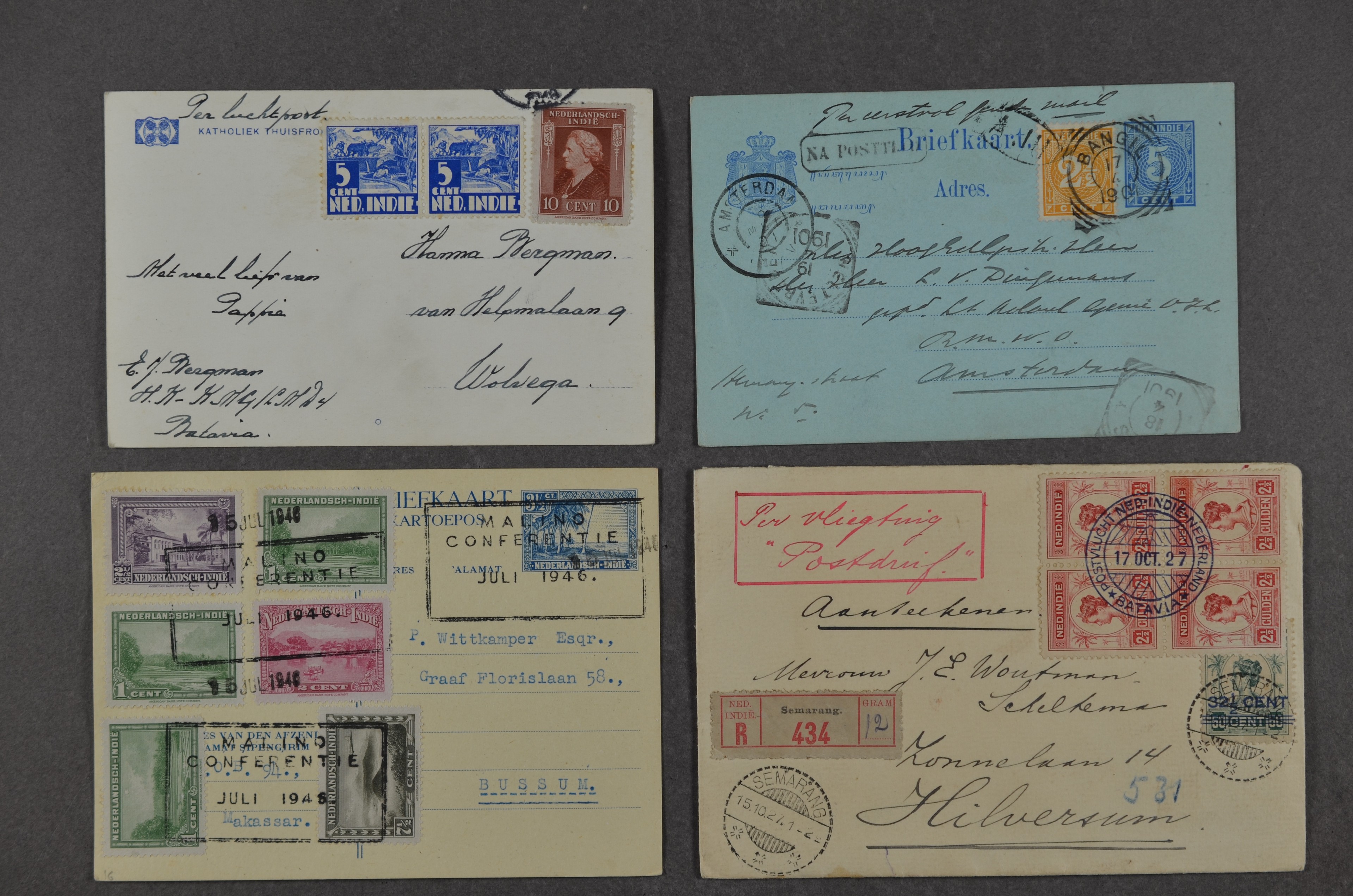 NED.- INDIË, meer dan 425 poststukken vanaf ca. 1860 w.o. met mooie frankeringen, allerlei soorten stempels incl. propaganda/gelegenheid (met iets uit Japanse bezetting), aangetekend, expresse, censuur, luchtpost, tevens iets Ned. Nieuw-Guinea w.o. 2 met Nederlandse portzegels, etc.