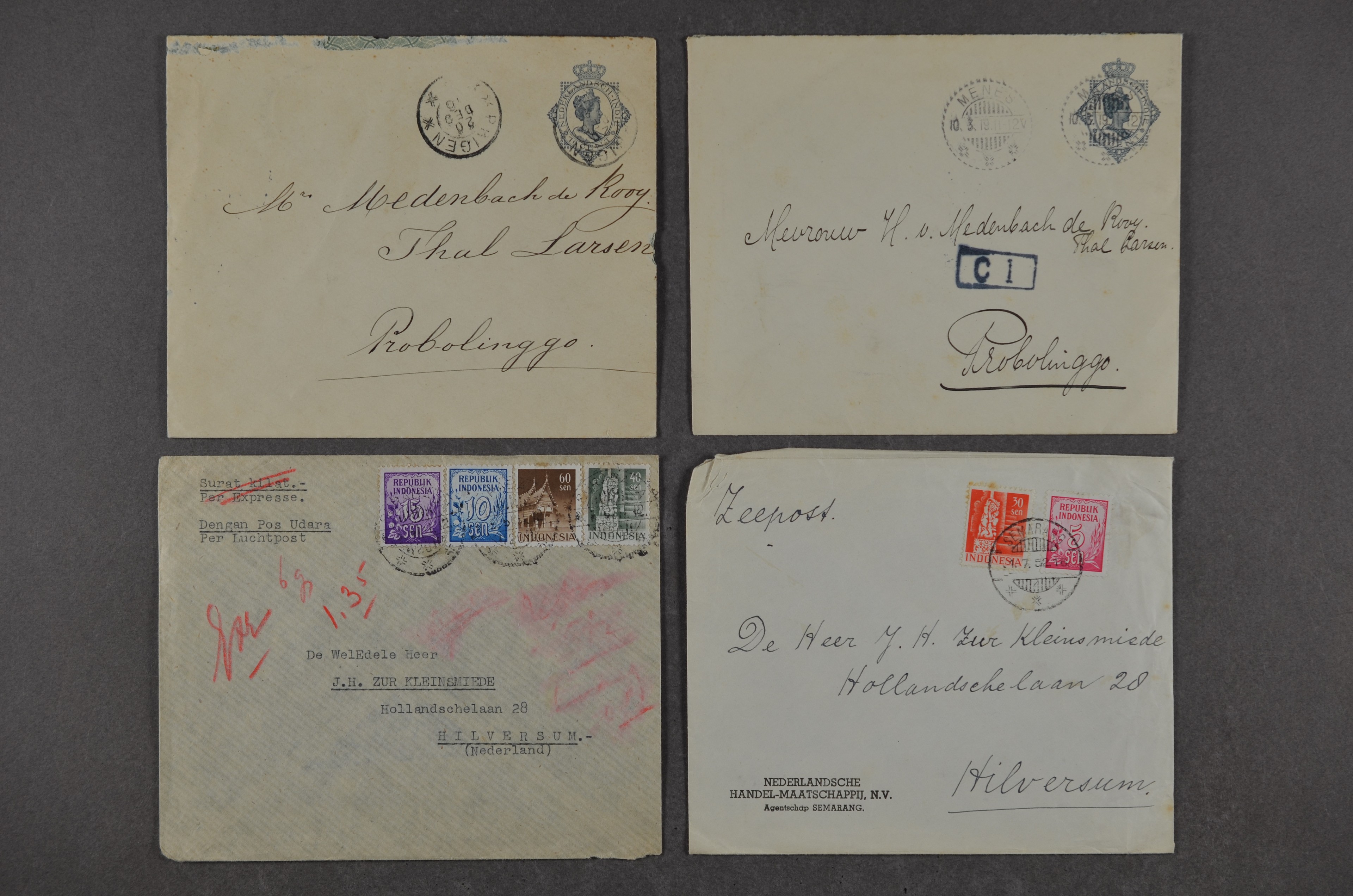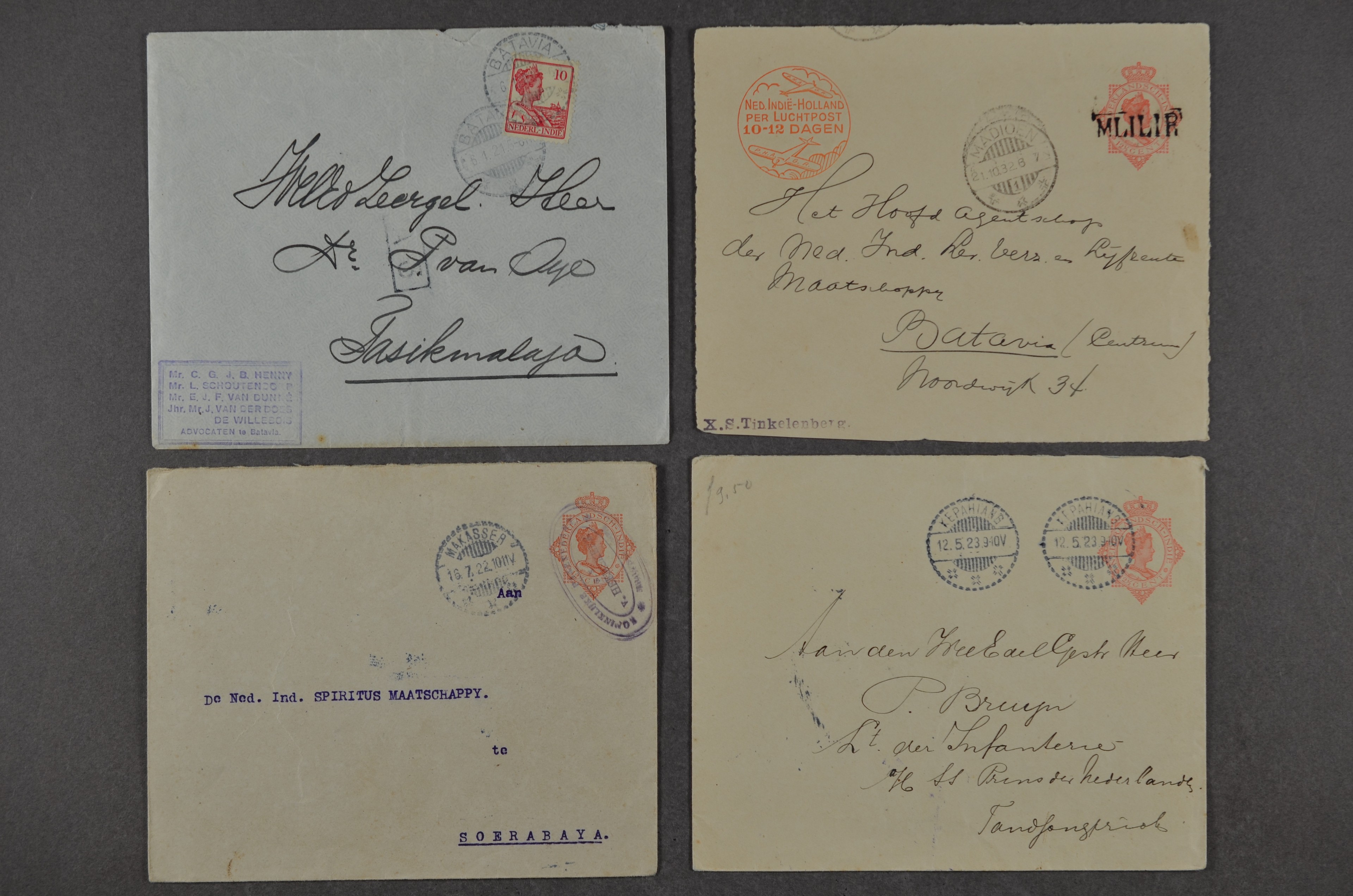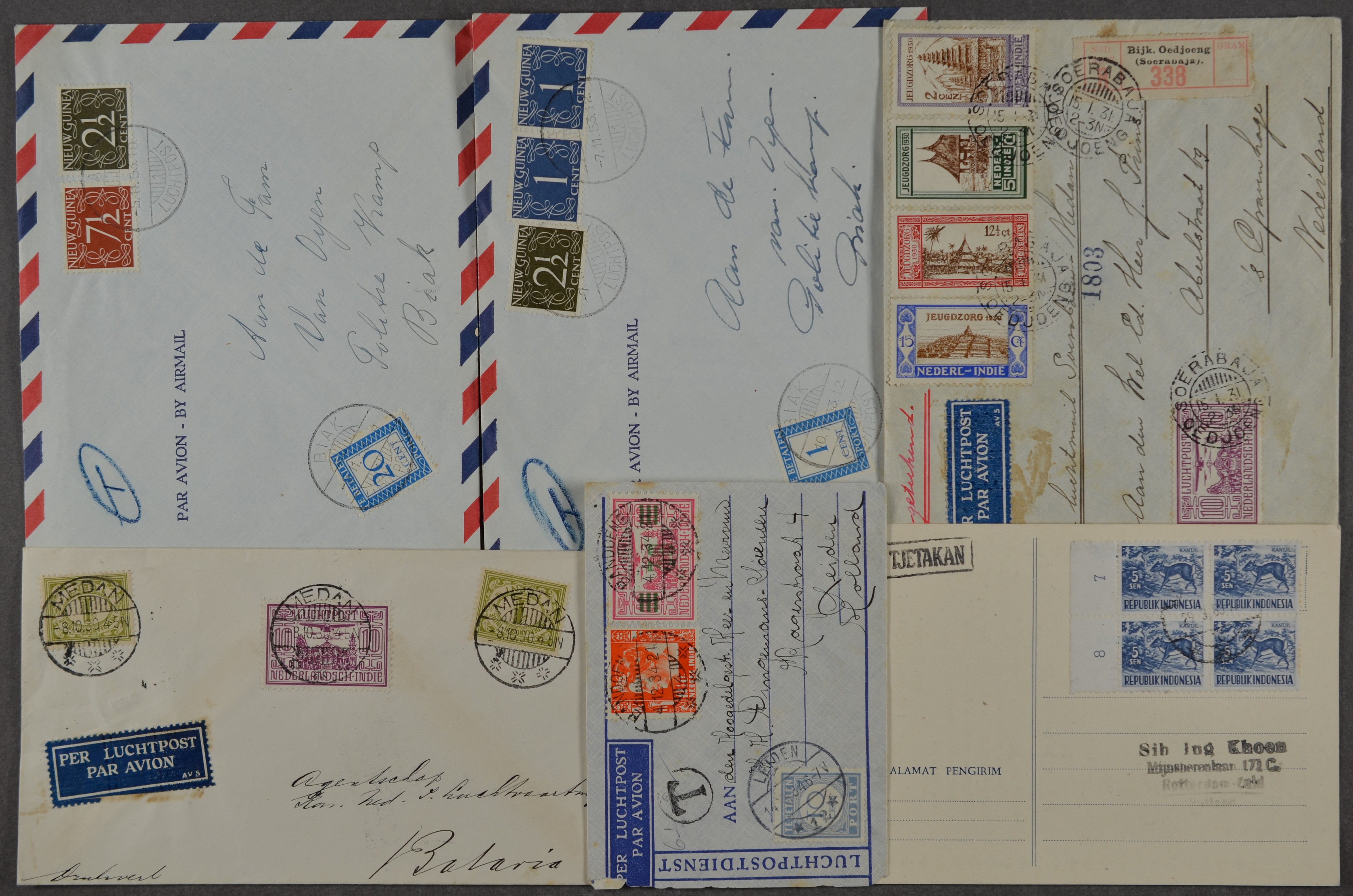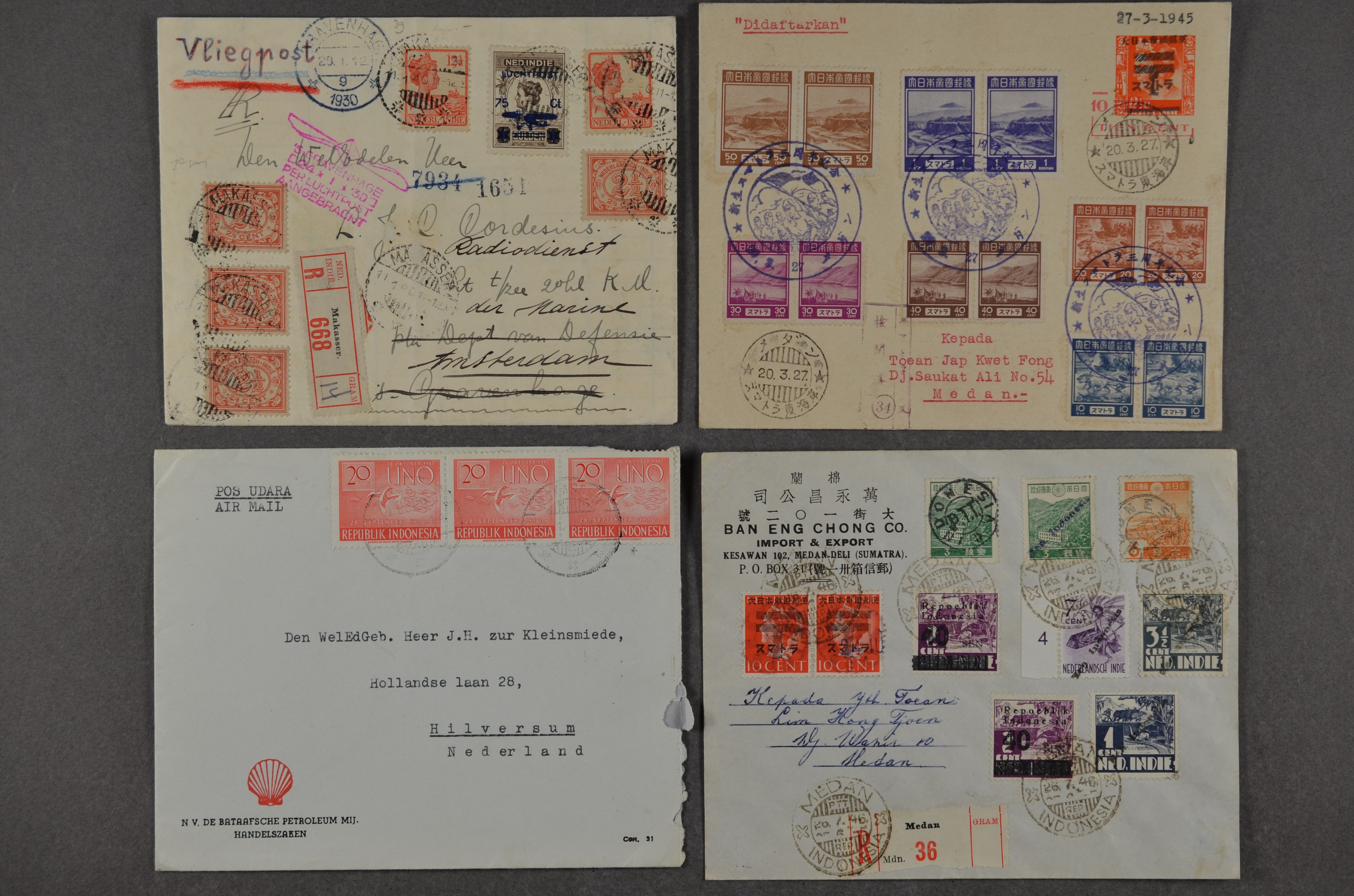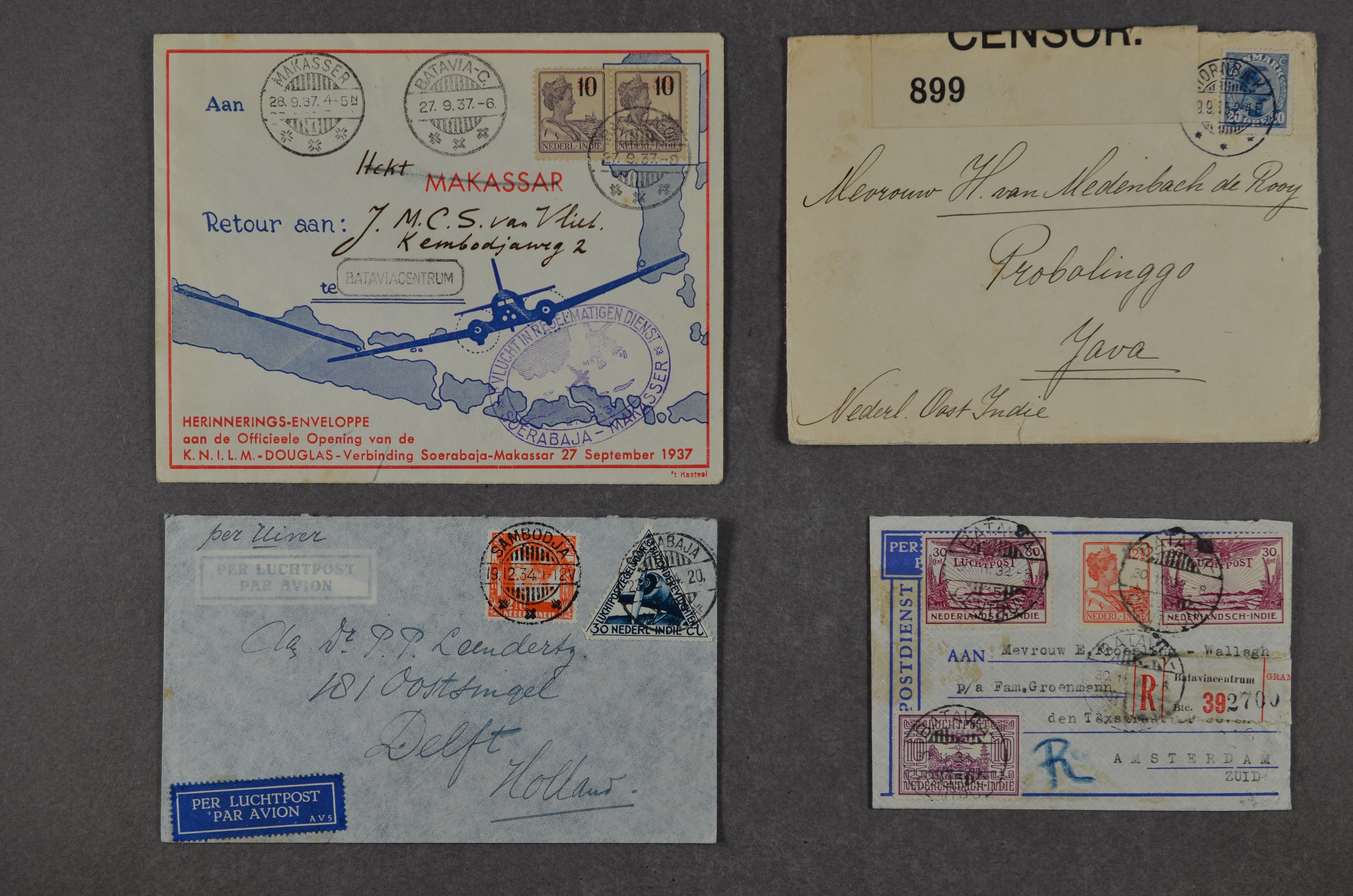 NED.- INDIË, meer dan 425 poststukken vanaf ca. 1860 w.o. met mooie frankeringen, allerlei soorten stempels incl. propaganda/gelegenheid (met iets uit Japanse bezetting), aangetekend, expresse, censuur, luchtpost, tevens iets Ned. Nieuw-Guinea w.o. 2 met Nederlandse portzegels, etc.