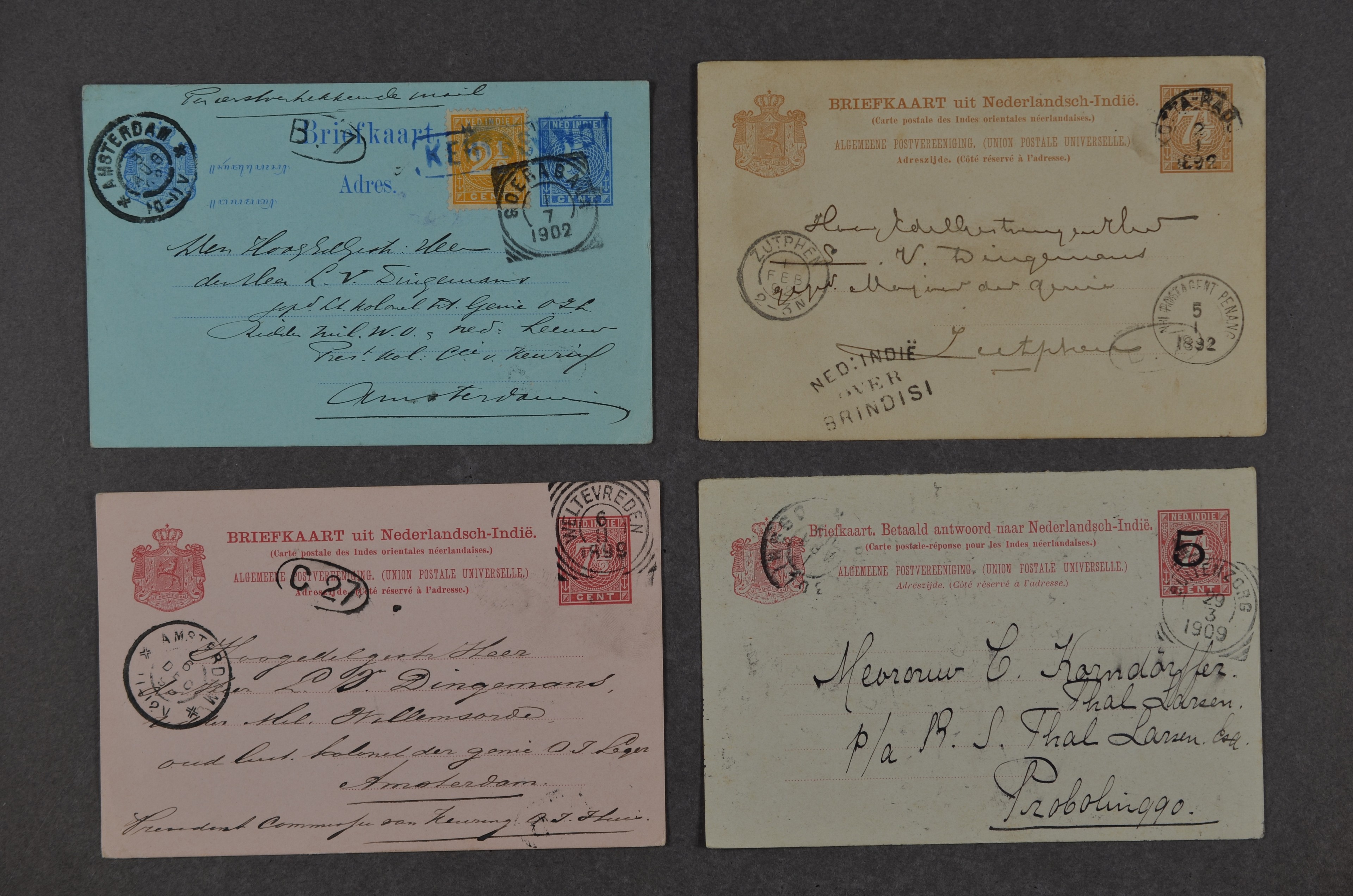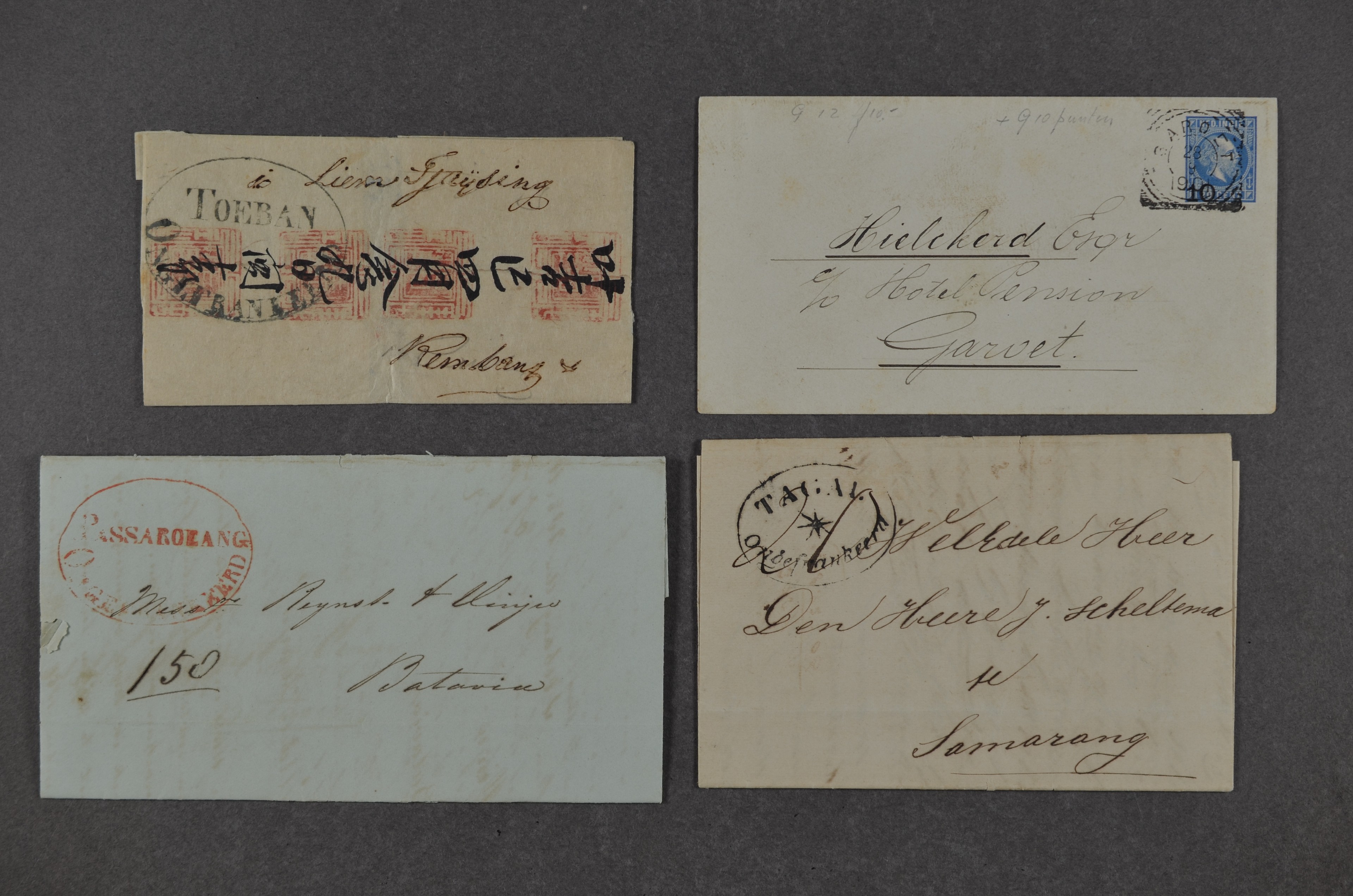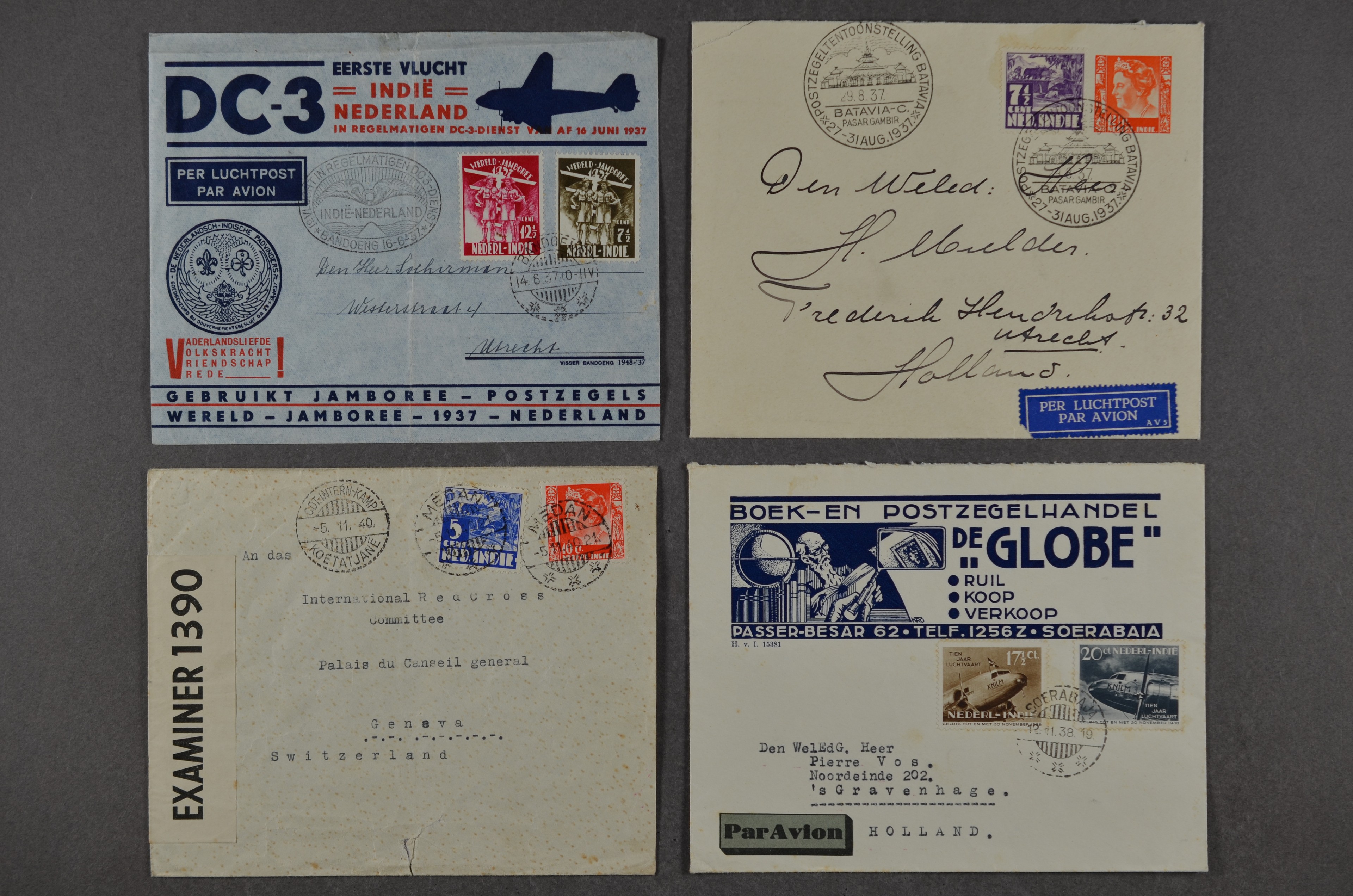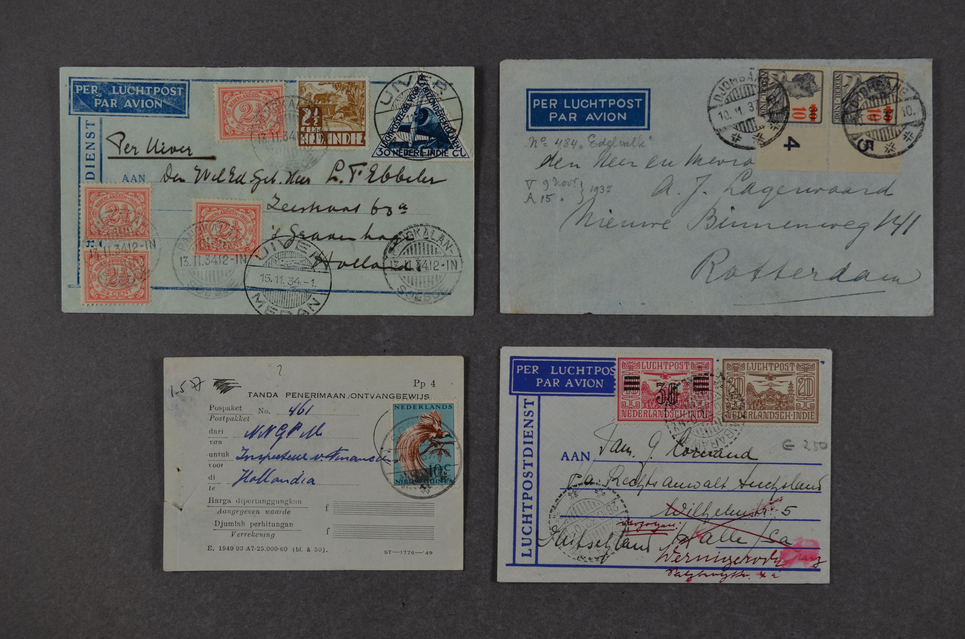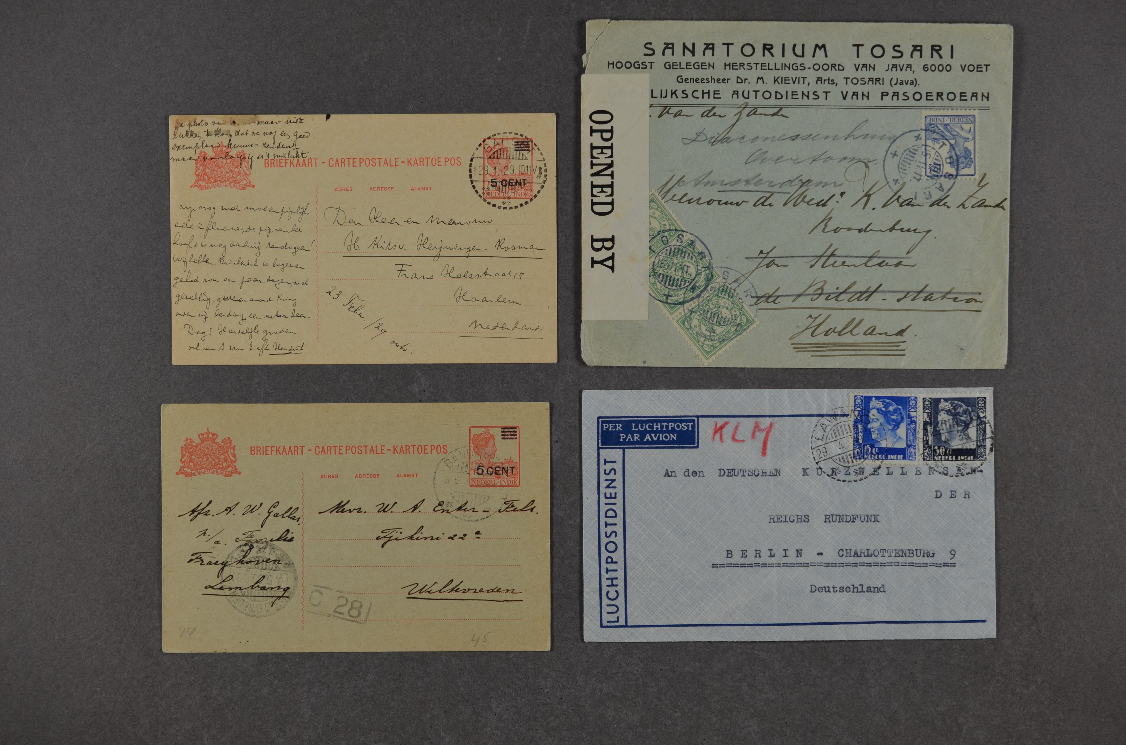NED.- INDIË, meer dan 425 poststukken vanaf ca. 1860 w.o. met mooie frankeringen, allerlei soorten stempels incl. propaganda/gelegenheid (met iets uit Japanse bezetting), aangetekend, expresse, censuur, luchtpost, tevens iets Ned. Nieuw-Guinea w.o. 2 met Nederlandse portzegels, etc.