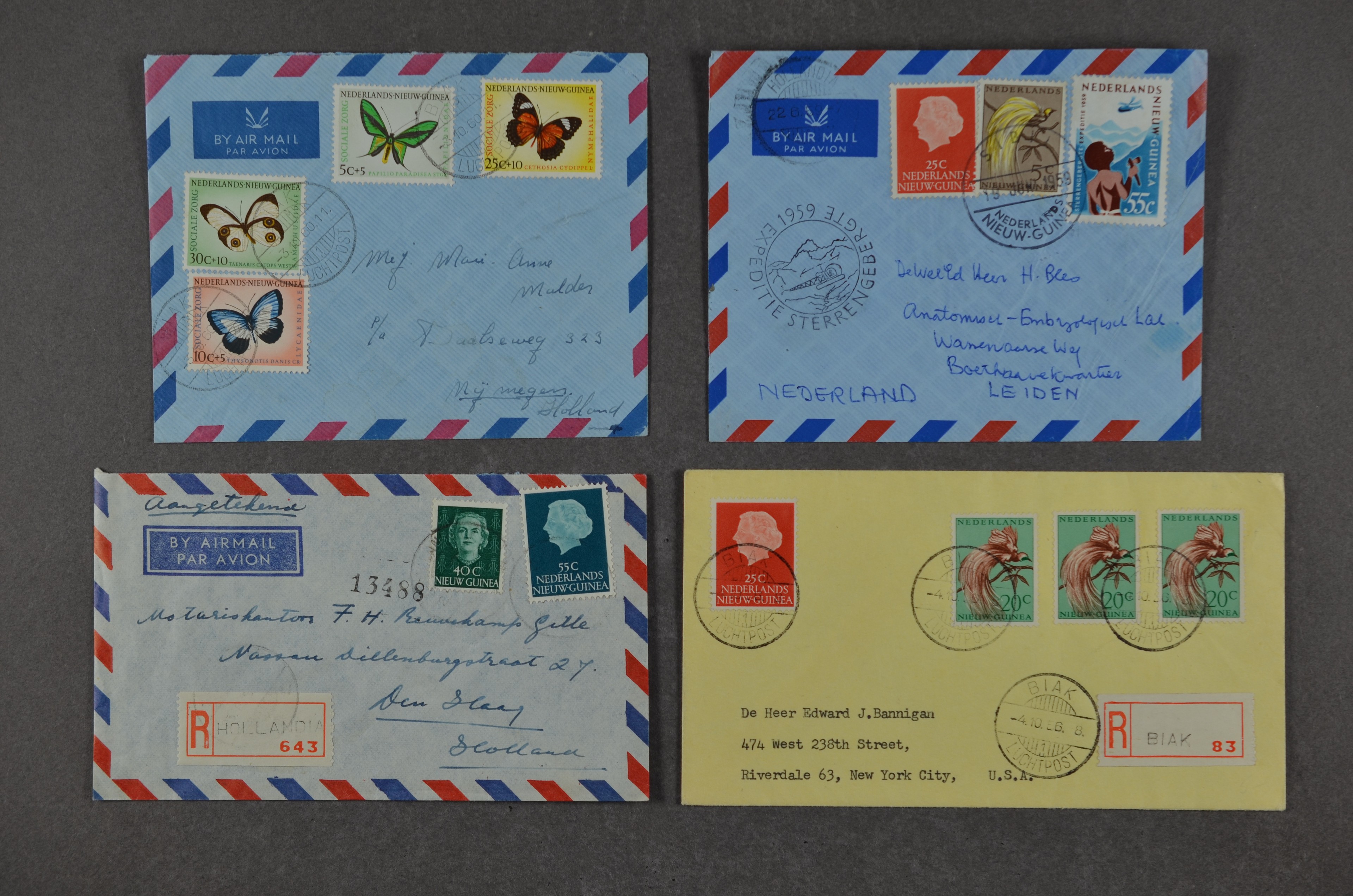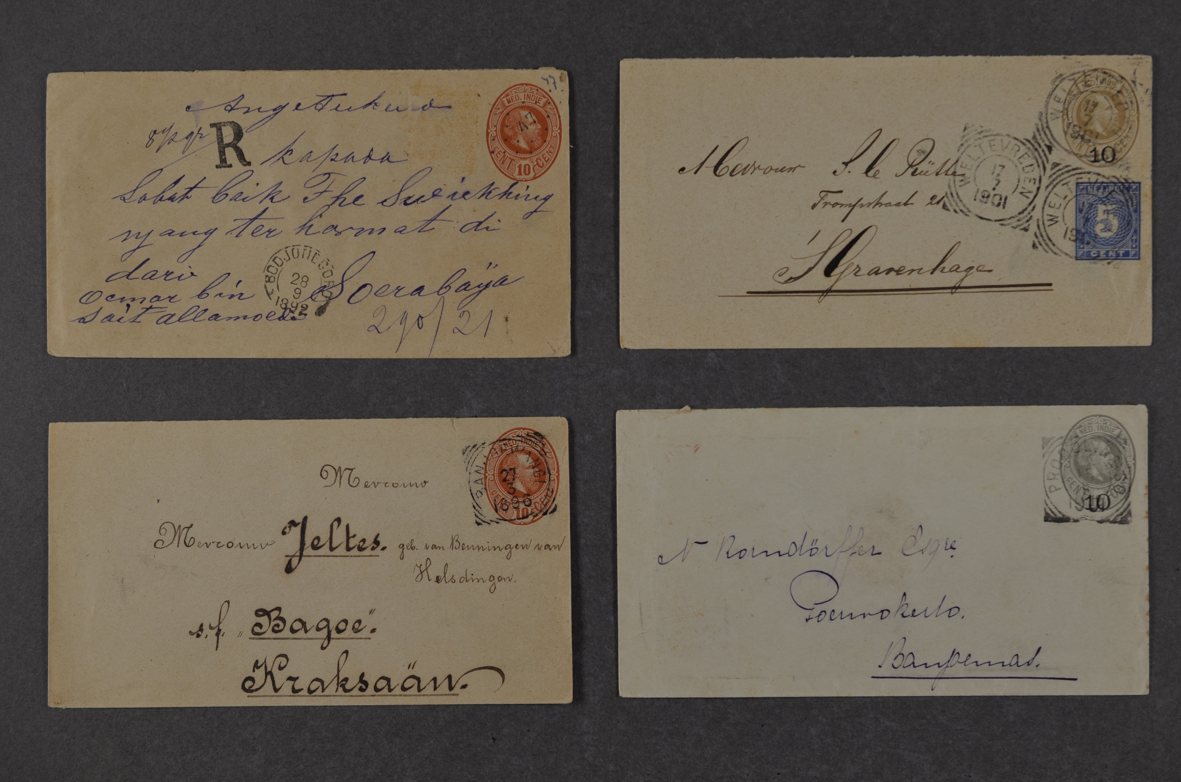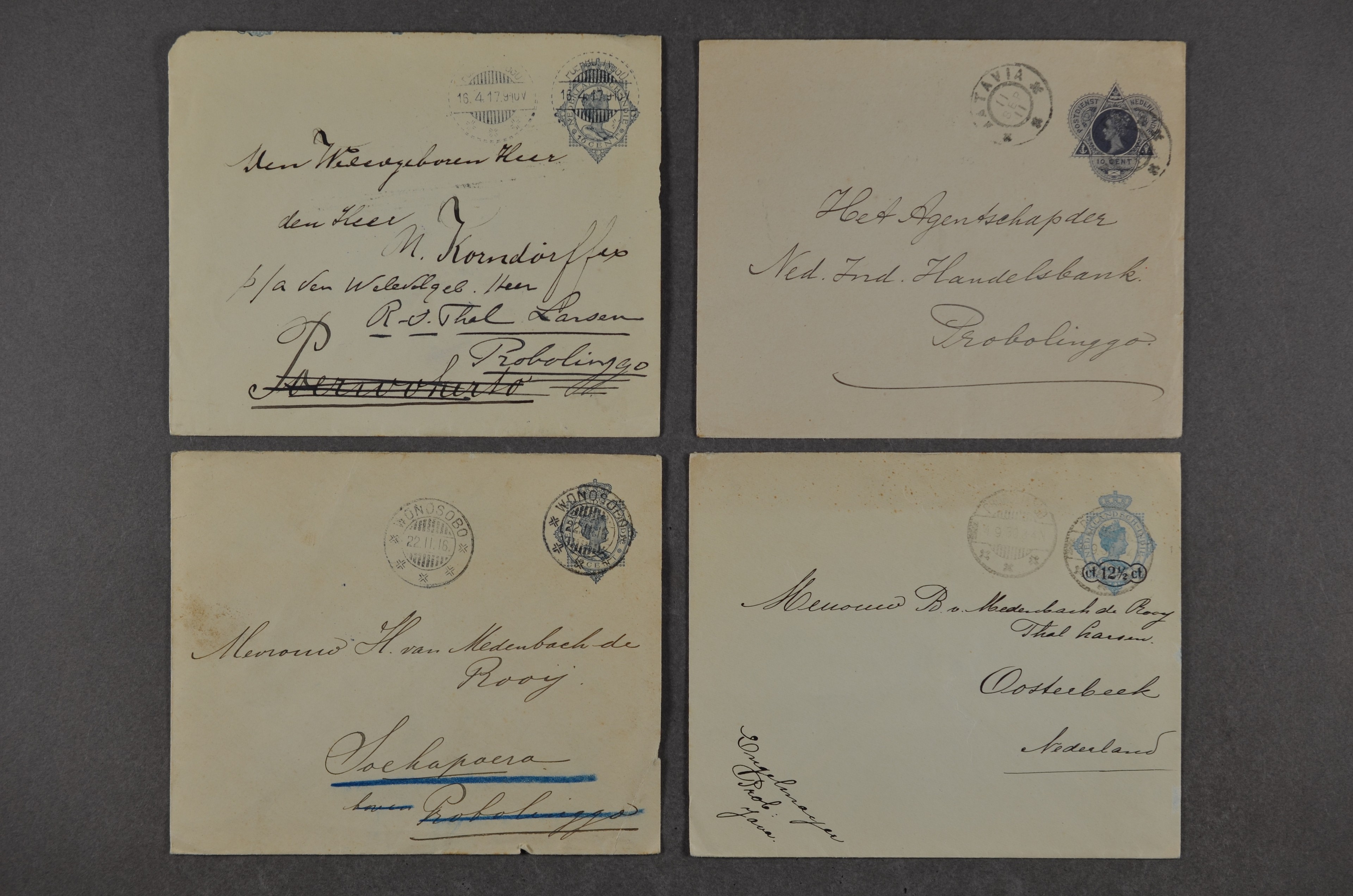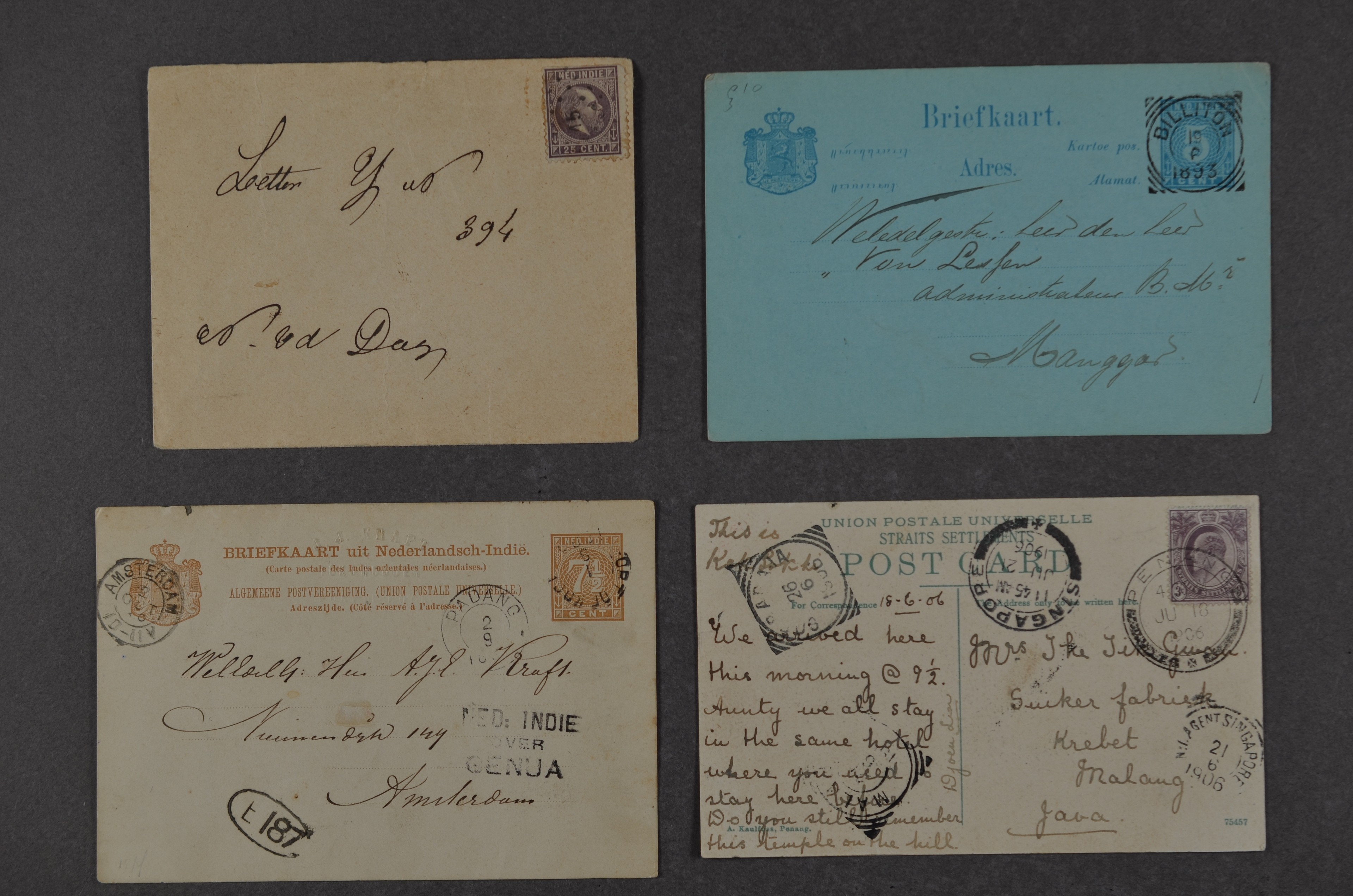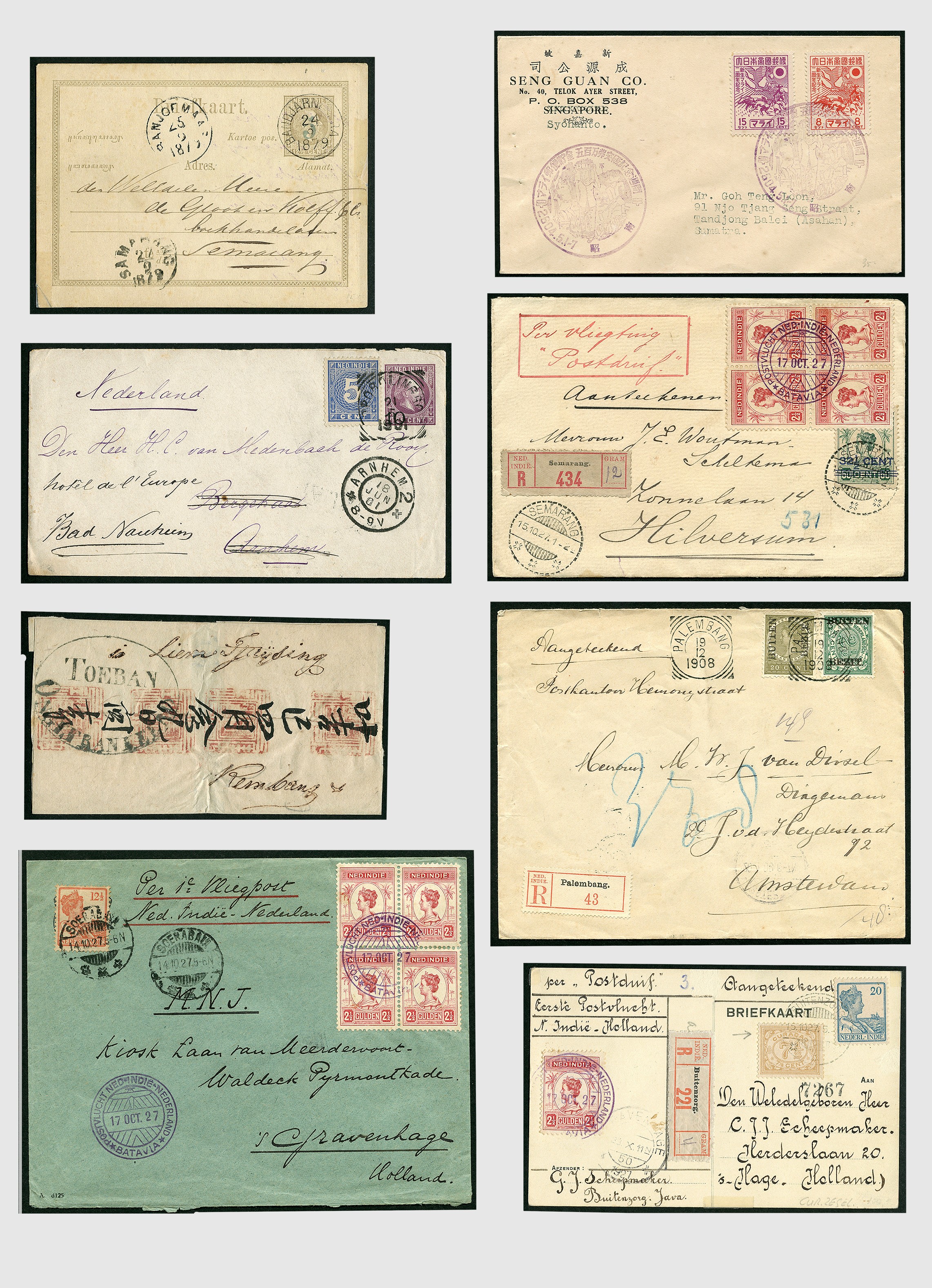 NED.- INDIË, meer dan 425 poststukken vanaf ca. 1860 w.o. met mooie frankeringen, allerlei soorten stempels incl. propaganda/gelegenheid (met iets uit Japanse bezetting), aangetekend, expresse, censuur, luchtpost, tevens iets Ned. Nieuw-Guinea w.o. 2 met Nederlandse portzegels, etc.