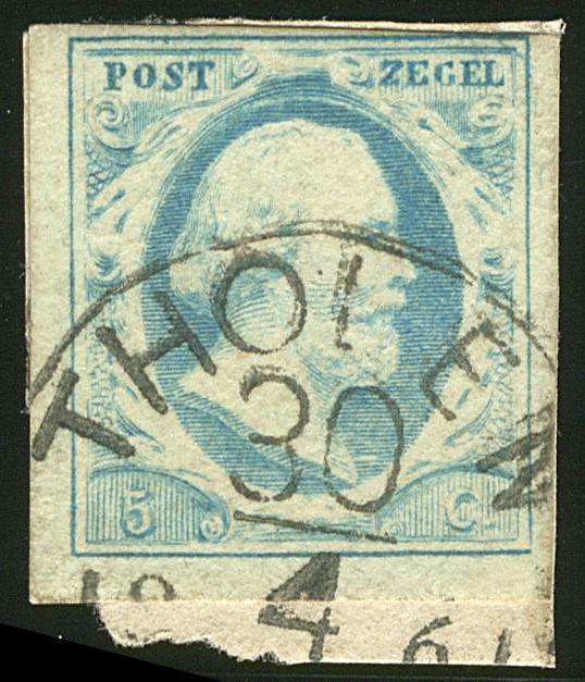 THOLEN C (EY.200) op 5 cent nr. 1n-Pl.IV-73. Aan drie zijden breed gerande zegel, nog op papier waardoor late datum 30-4-1861 volledig zichtbaar