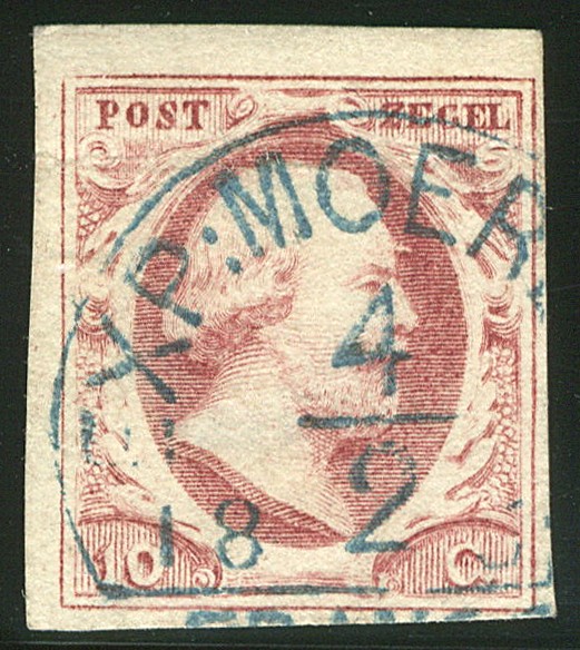 EXP:MOERDYK in blauw (EY.200++) op 10 cent nr. 2e-Pl.III-42. Smal tot breed gerande zegel met licht uitgeperste, niet storende vouw. Attest Vleeming (2019): 'Zeldzaam stempel, tot heden in blauw alleen dit exemplaar bekend.' In De Peijper (veiling 629, kavel 427) bevond zich een tweede exemplaar