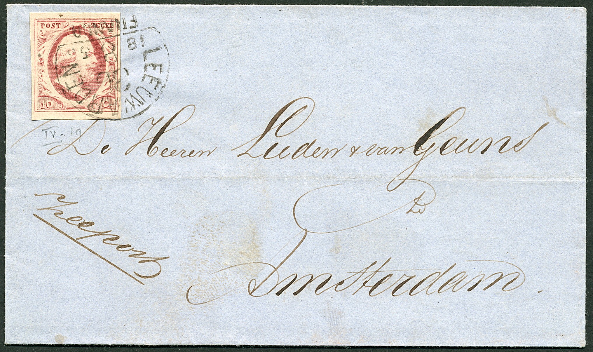 LEEUWARDEN C met Franco klein (EY.50) op 10 cent nr. 2g-Pl.IV-19. Vol tot breed gerand prachtex. met kopstaande afst. op frisse brief (nota) van 30-8-1856 per ´zeepost´ over de Zuiderzee met een particuliere bootdienst van Lemmer naar Amsterdam 31-8-1856