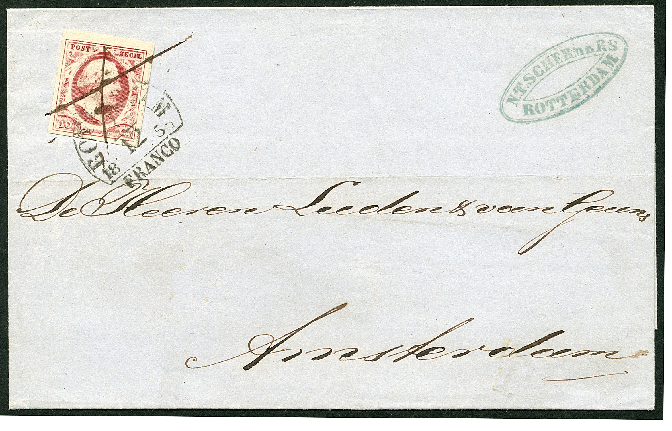 ROTTERDAM B groot (EY.150) op 10 cent nr. 2b-Pl.I. Vol tot breed gerand prachtex. met op de zegel te lichte afst. weshalve er nog met de pen een kruis doorheen werd getrokken, van 8-12-1853 naar Amsterdam 8-12-1853. Zie: Van Hussen blz. 30, afb. 27