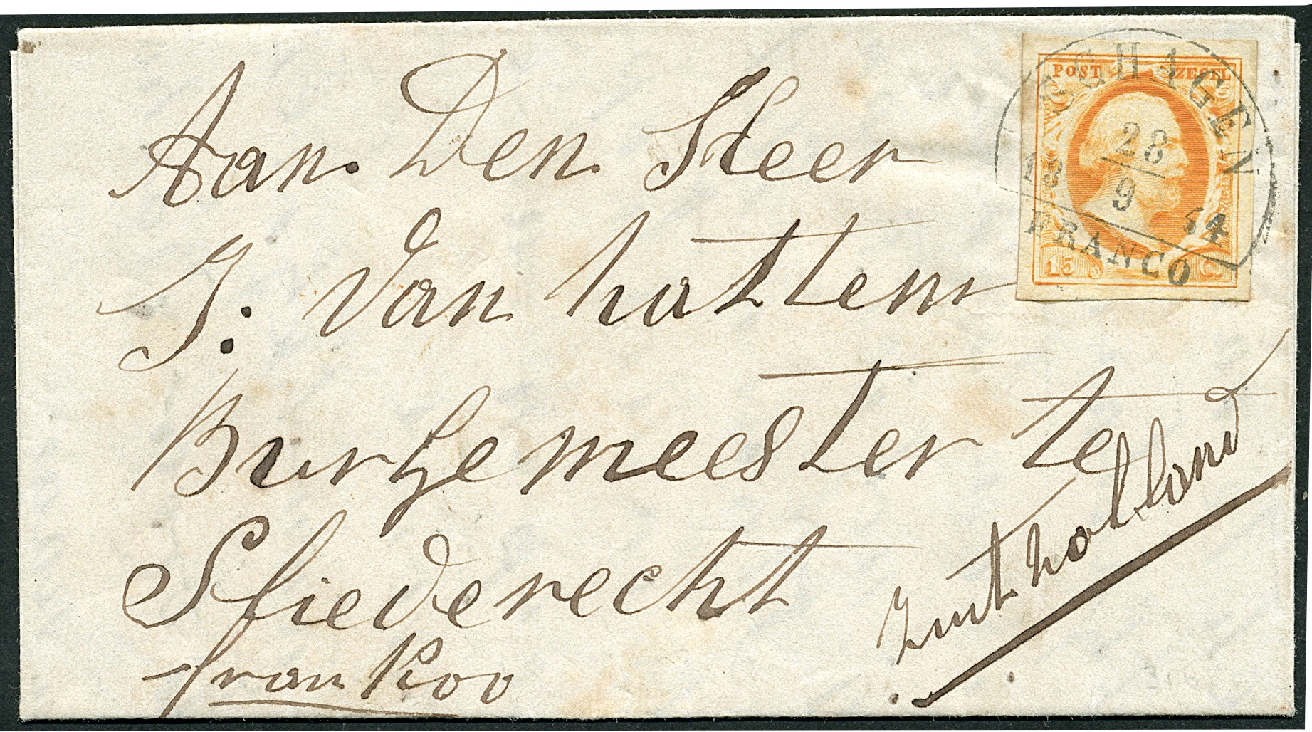 SCHAGEN B (EY.900) op 15 cent. Breed gerand prachtzegel met luxe afst. op complete brief geschreven te ´Annapouweloonapolder´ op 27-9-1854, over Schagen 28-9-1854 en Dordrecht 29-9-1854 naar de burgemeester van Sliedrecht. Ex Klink, De Peijper