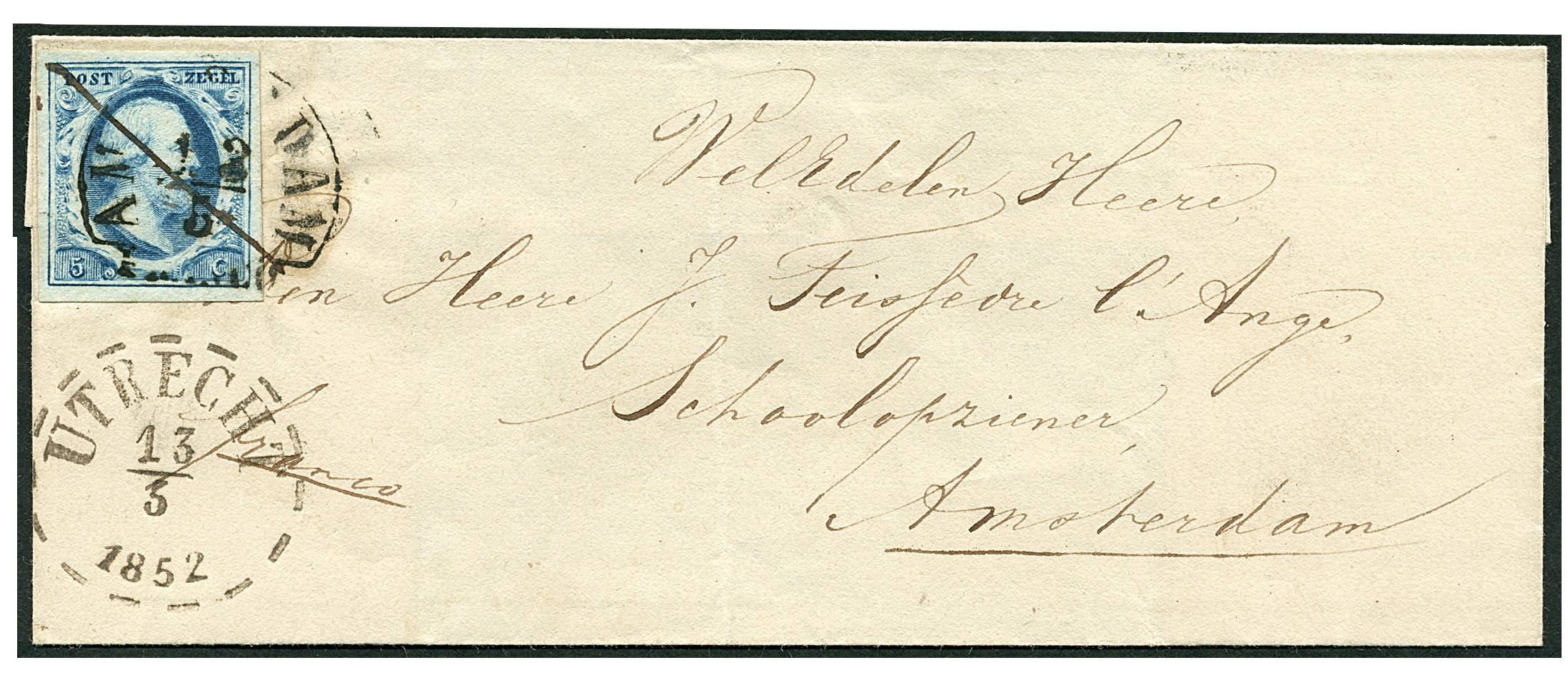 Spoorwegen. 5 Cent nr. 1b-Pl.I-58 (breed gerand prachtex.) vernietigd met een diagonaal getrokken streep, op briefomslag van Maarssen met op az. naamstempel in zwart en op vz. gebroken ringstempel Utrecht 13-5-1852 (luxe afdruk!), per spoorrijtuig naar Amsterdam, waar de zegel op 13-5 werd afgestempeld. Uitgebreide toelichting bijgevoegd