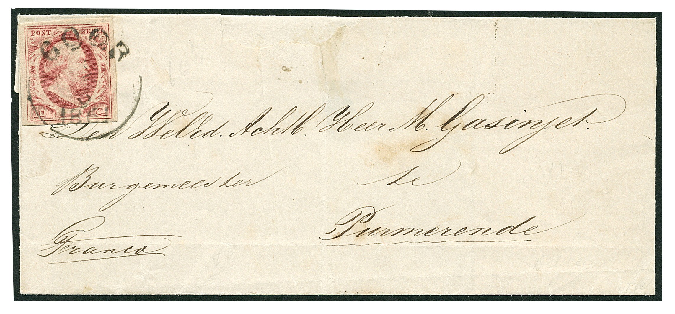 Spoorwegen. 10 Cent nr. 2l-Pl.VI-65 (prachtex.) afgest. met halve cirkelstempel Goor 9-5-1861 i.p.v. Franco, hetgeen in strijd met de voorschriften was, op briefomslag (bovenaan gerepareerd) van Delden (az. groot naamstempel in zwart) naar Purmerend 10-5-1861. Van der Willigen (1955) afb. 23 op blz. 46