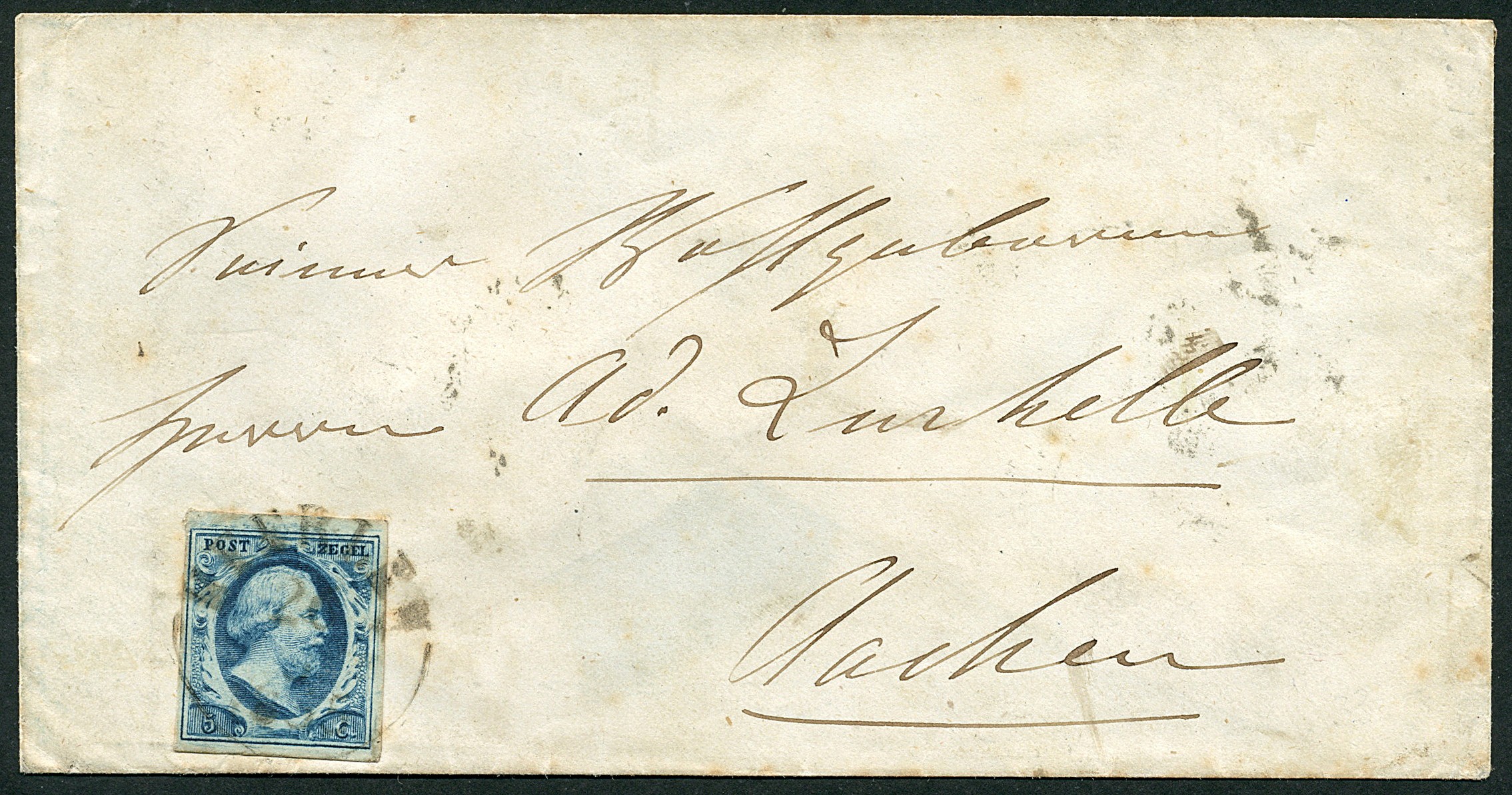 Spoorwegen. 5 Cent nr. 1i-Pl.III-85 (links iets smal, overigens prima gerande zegel) afgest. met halve cirkelstempel Heerlen 26-5-1855, op wat minder fris couvert (az. twee mooie lakzegels), volgens grenstarief gefrankeerd naar Aachen 26-5. In EY afb. 203: ´De stempelafdruk is in strijd met de voorschriften aangebracht (unieke brief)´. Volgens ons dateert de brief uit 1855 i.p.v. 1858