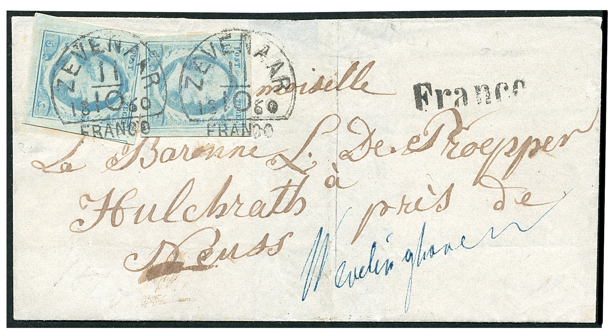DUITSE STATEN, PRUISEN. 5 Cent nr. 1n-Pl.IV-81 en 27, beide zeer breed gerande prachtex. (ter controle zijn de zegels van de brief verwijderd, voorzien van keurstempel Dr. Louis, en met plakker op de oorspronkelijke plaats aangebracht) met twee luxe afst. Zevenaar C (EY.500) op briefomslag van 11-10-1860 via traject Emmerich/Oberhausen 11-10 en Neuss naar barones de Proepper (zu Hülchrath) in het nabijgelegen Hülchrath 12-10. Correct grenstarief van 5 cent tot de grens + 5 silbergroschen = ca. 5 cent tot de bestemming, tevens in Duitsland afgest. met ´Franco´. Zeer zeldzame brief!