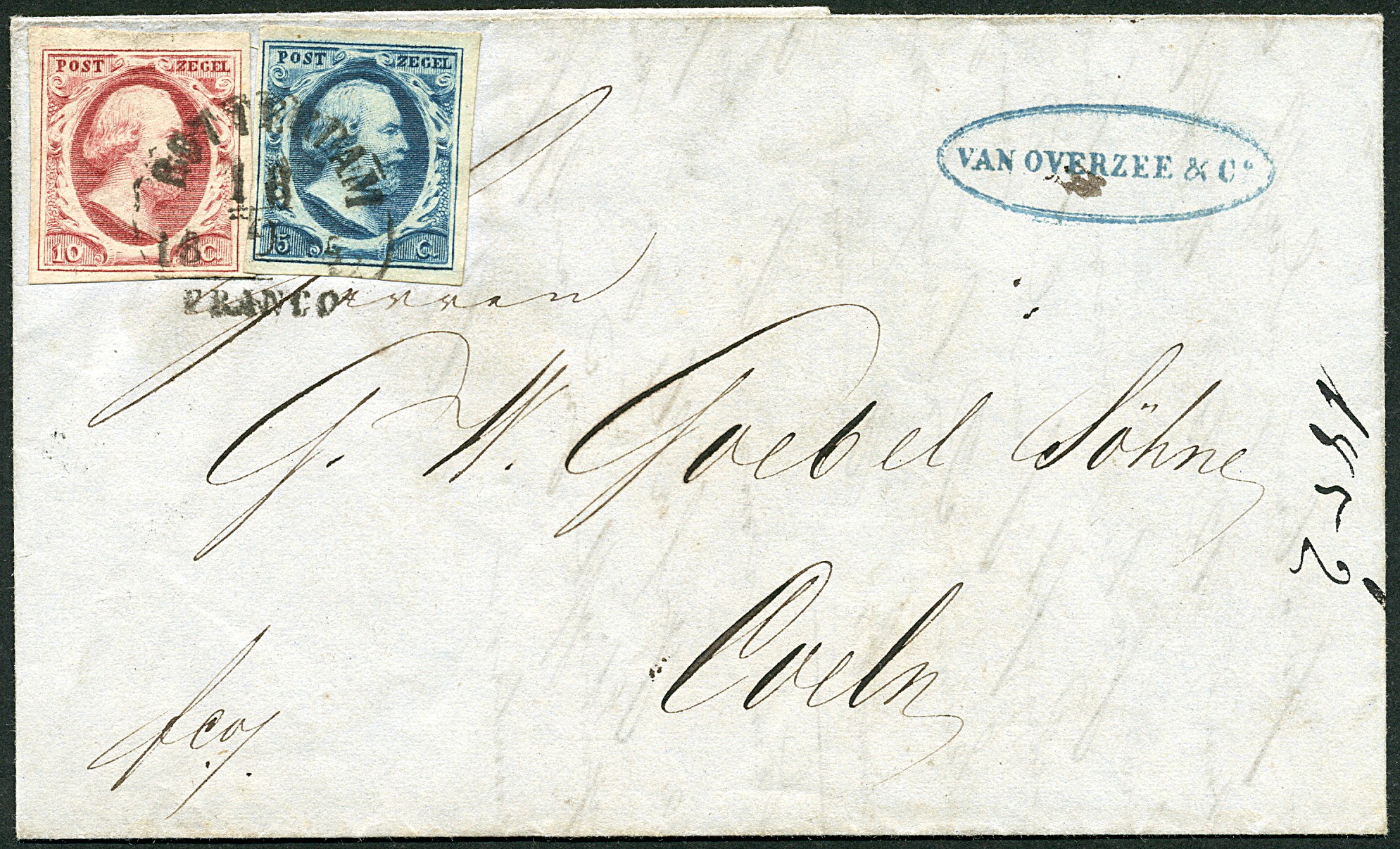 DUITSE STATEN, PRUISEN. 5 Cent nr. 1b-Pl.I-57 en 10 cent nr. 2b-Pl.I-21, beide zegels normaal tot breed gerande prachtex., met centrale afst. Rotterdam B klein (EY.50 en 50), op brief van 18-9-1852 naar Coeln 19-9. Zie: EY. afb. 3 met uitleg tarief. Attest Dr. Louis (1984)