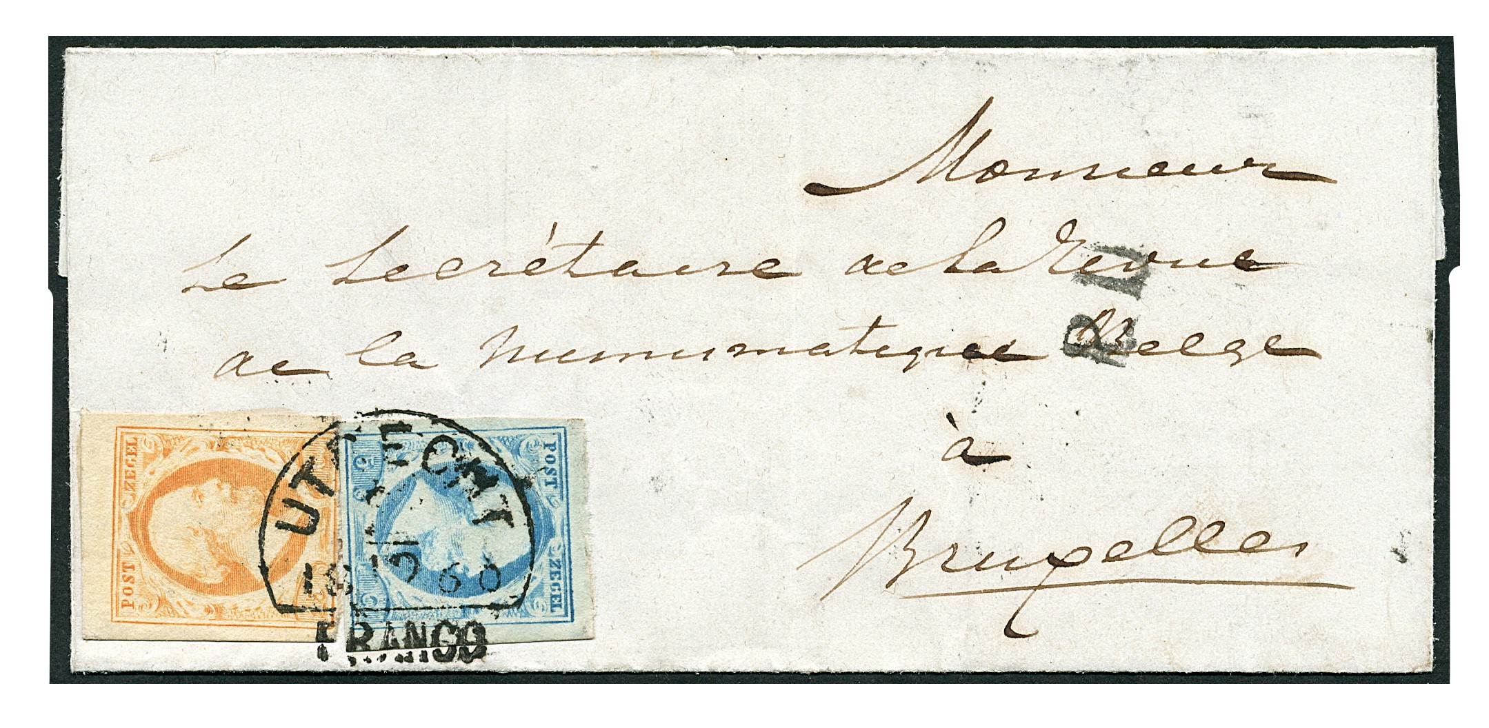 BELGIË. 5 Cent nr. 1n-Pl.IV-55 (vol tot breed gerand prachtex.) en 15 cent nr. 3b (onder smal, overigens breed tot zeer breed gerand) met centrale afst. Utrecht C met Franco groot (EY.50 en 300) op frisse briefomslag van 28(?)-12-1860 met op az. grenskantoorstempel Hollande Nord No.1 28-12-1860 naar de secretaresse van de ´Revue de la numismatique belge´ te Bruxelles 28-12-1860, met op vz. ´P.D.´ in zwart. Cert. Vleeming (2016)