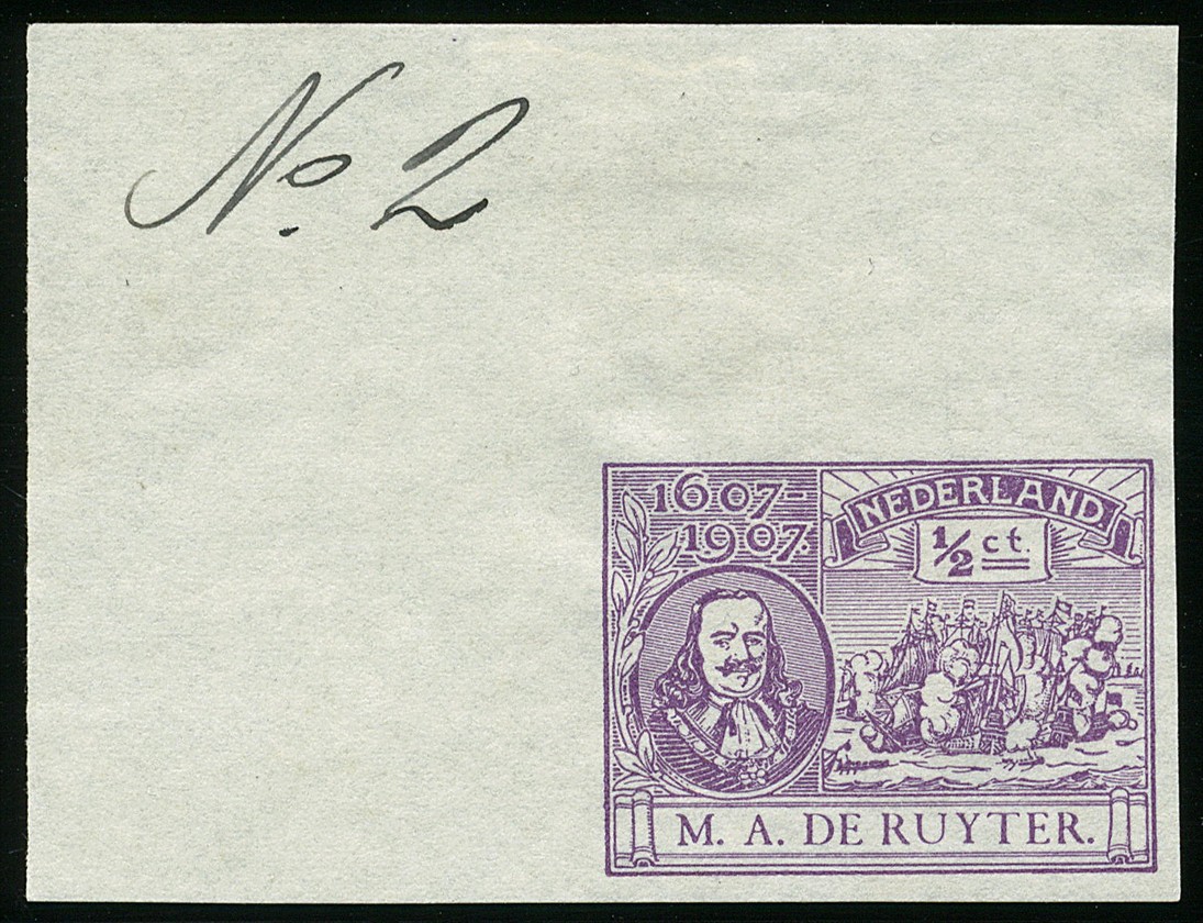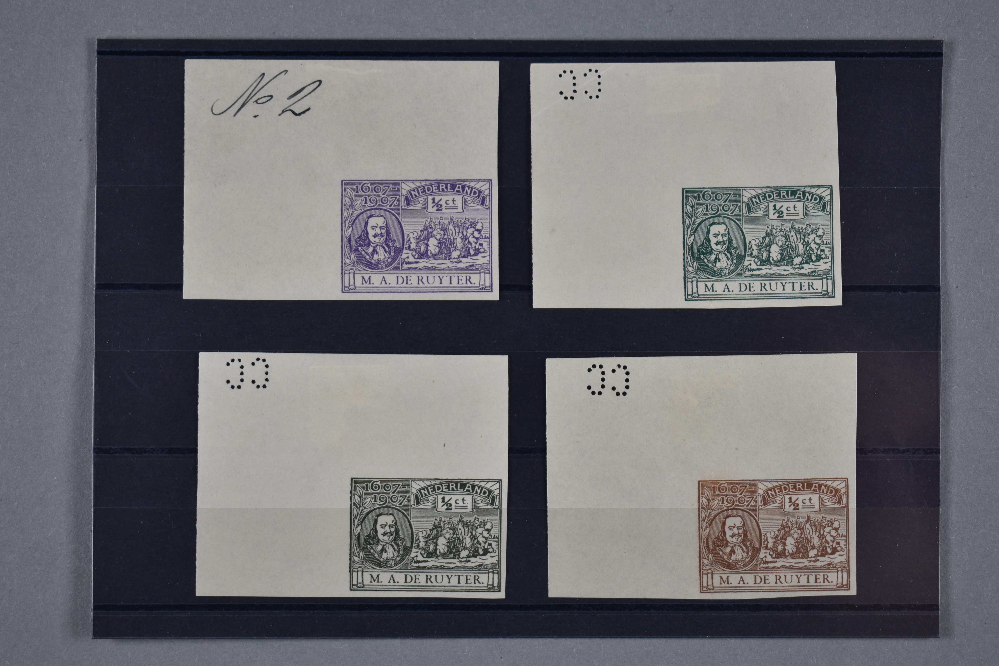 PC143 c, e, f en i, ongetande kleurproeven van De Ruijter, linkerhoekrandstukken uit de oorspronkelijke velletjes van vier stuks geknipt HFL.1850