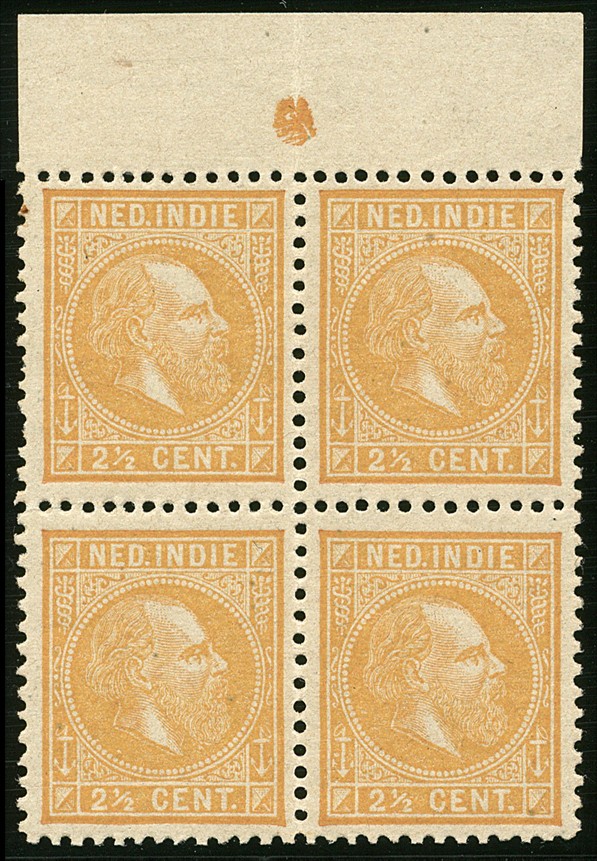 7F, 2½ cent geel in postfris bovenrandblok van vier, linksboven ex. mist 2 tandjes, ov. prachtex. 3 postfrisse zegels noteren € 1200