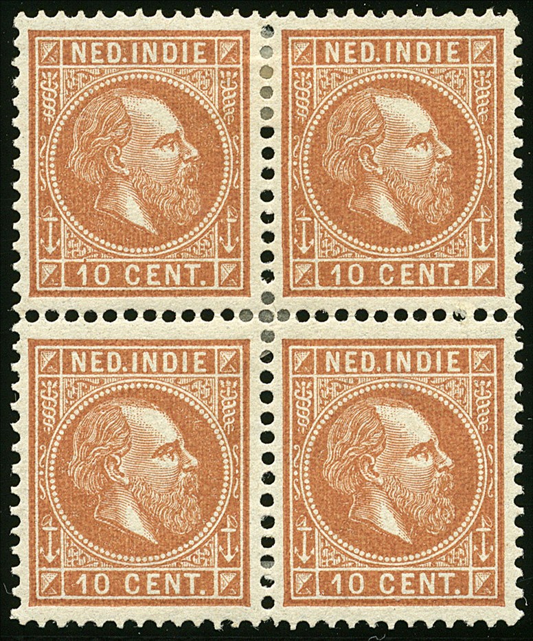9F, 10 cent oranjebruin, Kt.12½ x 12, in ongebruikt prachtblok van vier met cert. Vleeming (2014) € 2200 +