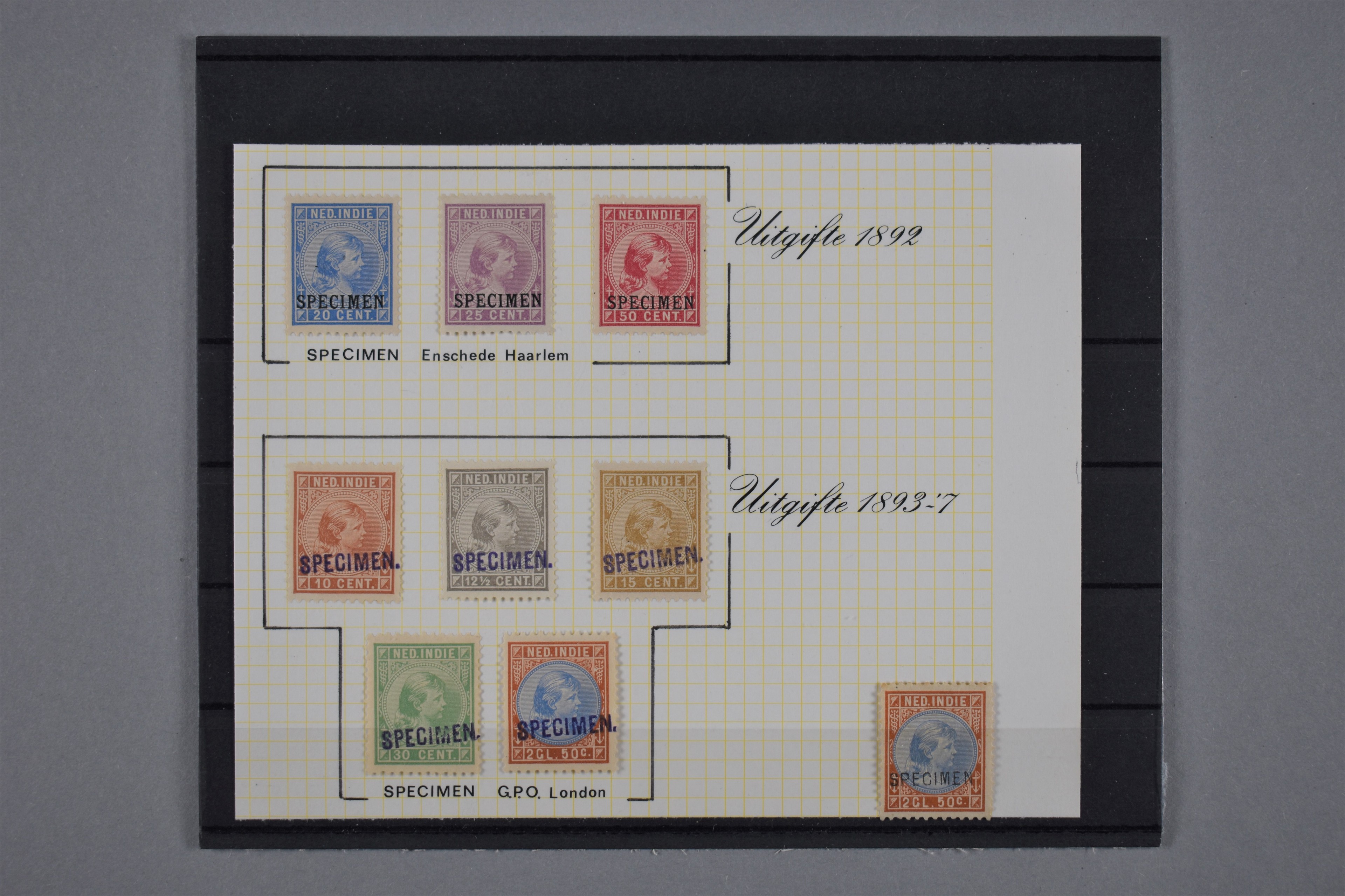 23/30, Wilhelmina met Hangend Haar, 3 verschillende opdrukken SPECIMEN, van Joh. Enschedé & Zn. in zwart op de 20, 25 en 50 cent in type met schreefletters en 2½ gulden in type zonder schreefletters, door de G.P.O. te London in violet met punt op de 10, 12½, 15 en 30 cent en de 2½ gulden. Ex Bulterman