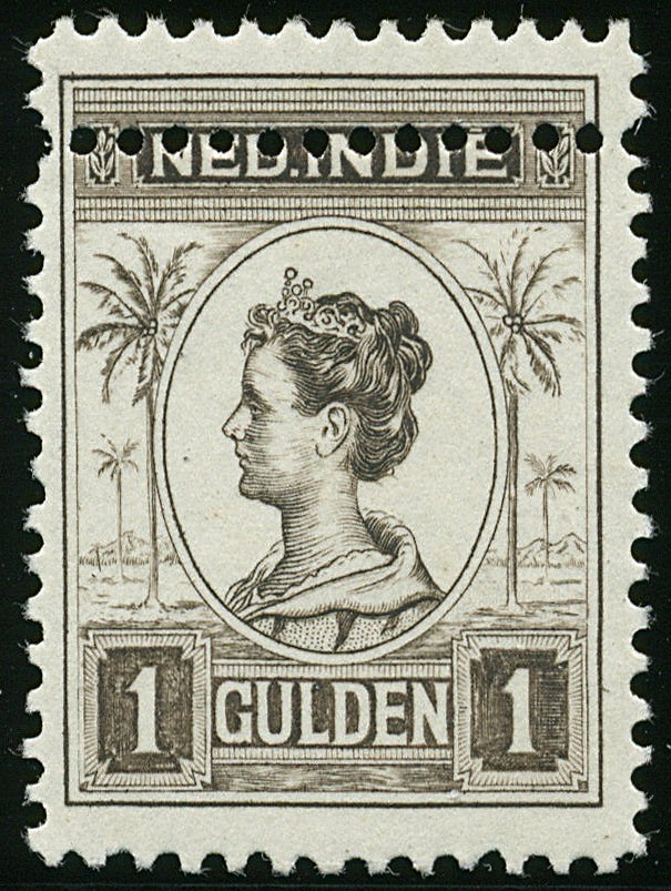 132B, 1 Gulden Koningin Wilhelmina met palmbomen, Lt. 11½ met variëteit ´Dubbele perforatie boven´, ongebruikt prachtex.