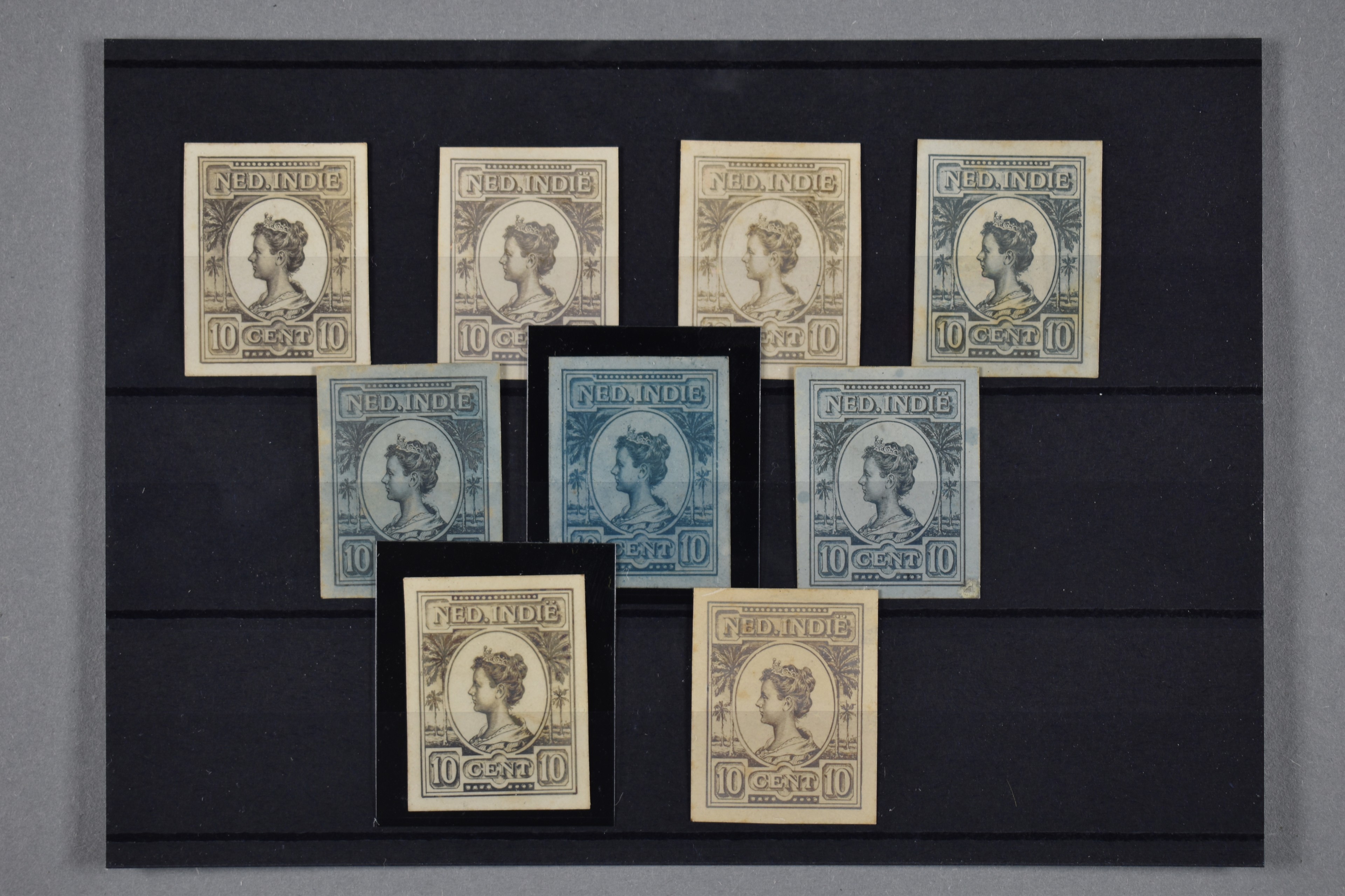 Emissie Koningin Wilhelmina met palmbomen 1913. PC.98, 9 fotografisch vermenigvuldigde proeven op dik papier in een niet gekozen tekening van 10 cent, formaat 21,5x28 mm, in verschillende kleurnuances grijs, bruin en blauw