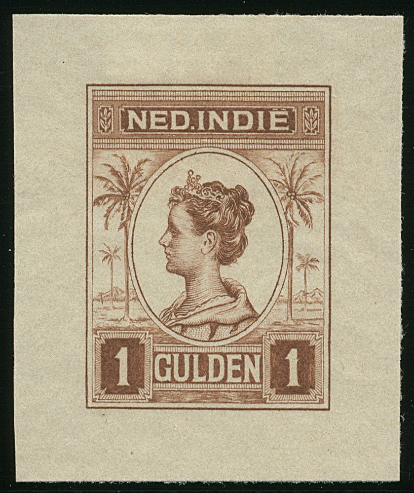 Emissie Koningin Wilhelmina met palmbomen 1913. PC.105a/l, 12 stempelafdrukken van de 1 gulden in de kleuren groen, donkergroen, roodbruin, bruin (gekozen kleur), blauw, donkerblauw, karmijnrood, bruinrood, donkerlila, olijfgeel, oranje en grijszwart. Ongetand en ongegomd op klein velletje