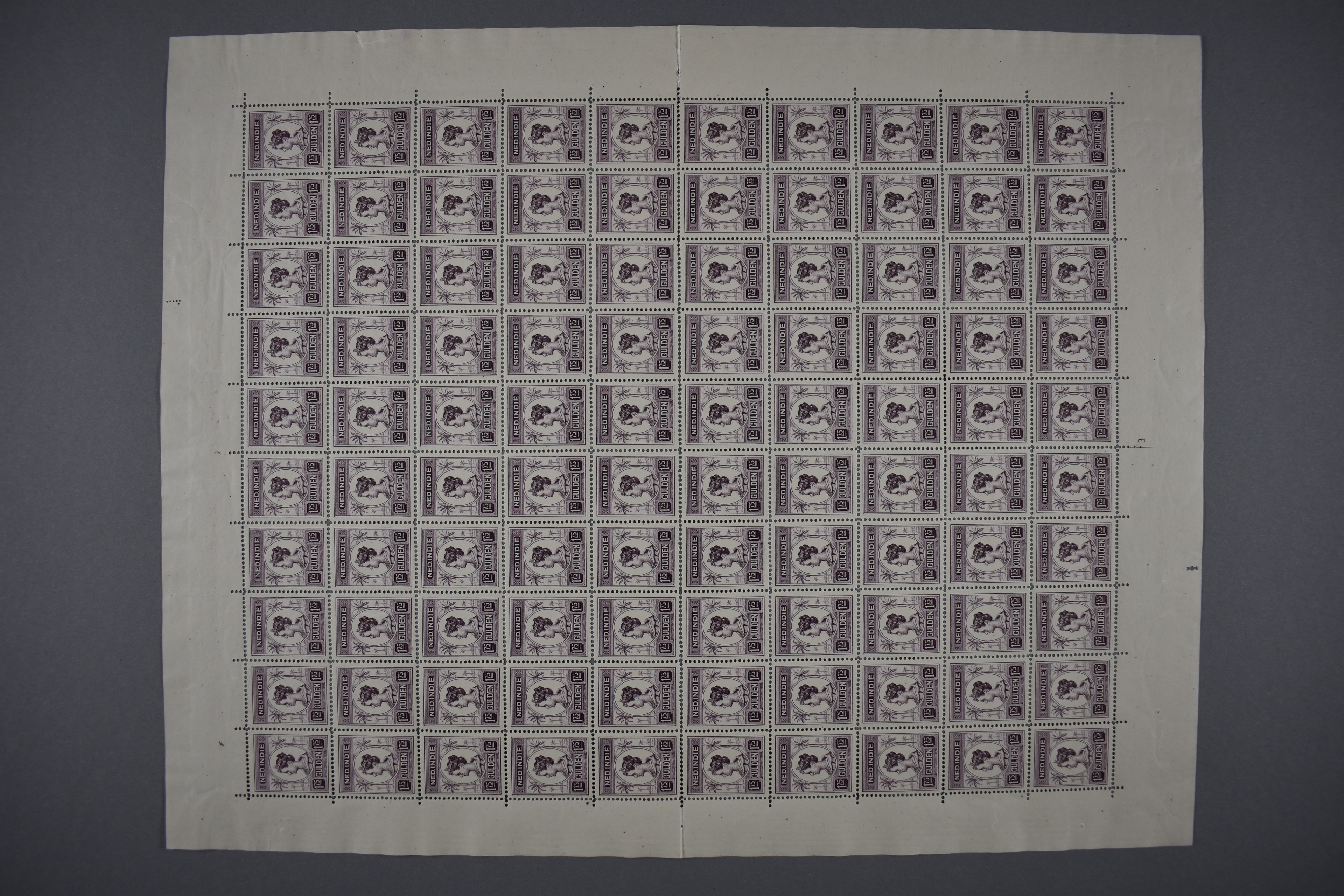 133, 1.75 Gulden Wilhelmina met palmbomen in compleet postfris vel van 100 zegels (tanding tussen rijen 5 en 6 wat losgeraakt) met plaatnummer 3. € 10.000