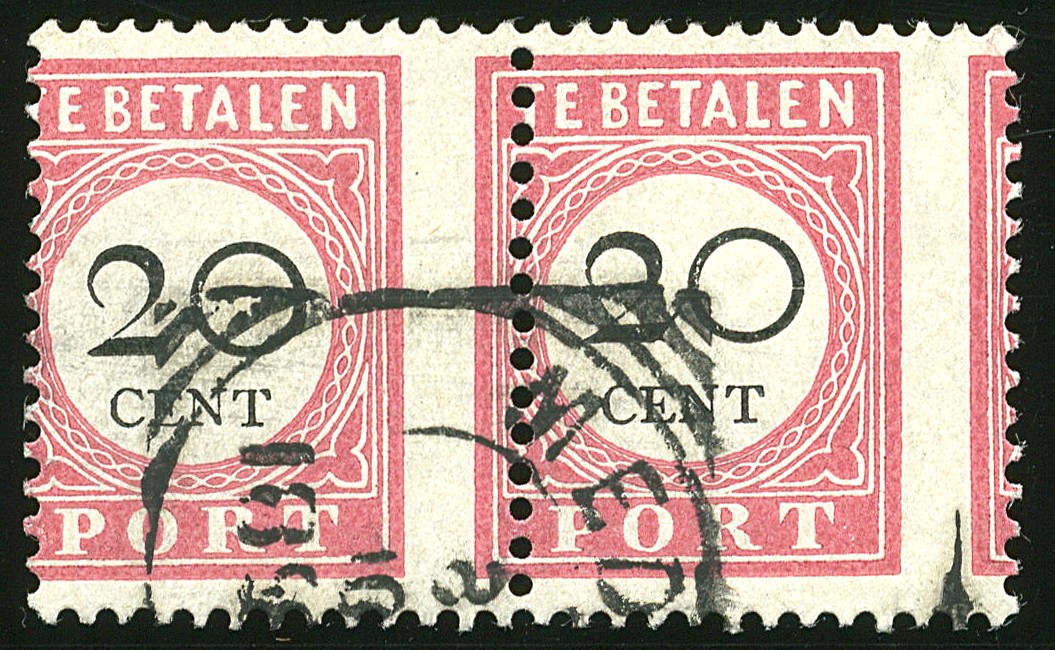 P18, 20 cent in prachtpaar met variëteit ´Sterk verschoven verticale tanding´, in Medan gebruikt. Het zwarte vlekje rechtsonder in de rand is stempelinkt. Leuke curiositeit!