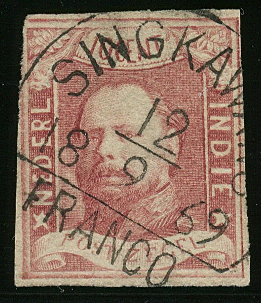 Halfrond-franco SINGKAWANG op 10c nr. 1. Zeer fraaie zegel met vrijwel volledige, mooie scherpe afst. van 12-9-1869