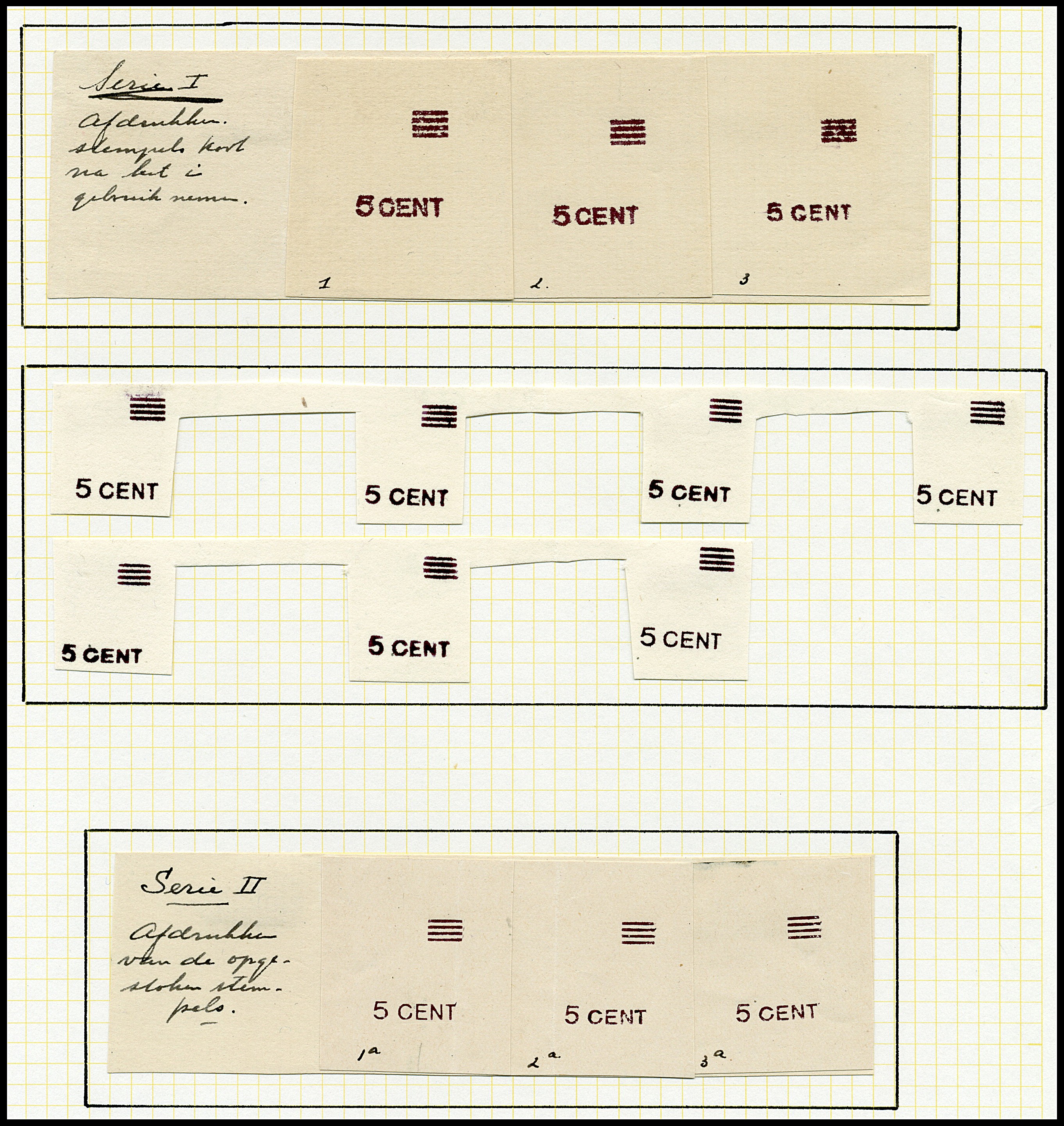 Proefdrukken voor de opdruk ´4 strepen en 5 CENT´ voor briefkaarten G40/43, Serie I (met de pen: ´Afdrukken stempels kort na het in gebruik nemen.´) en Serie II (met de pen: ´Afdrukken van de opgestoken stempels.´), op stukjes papier