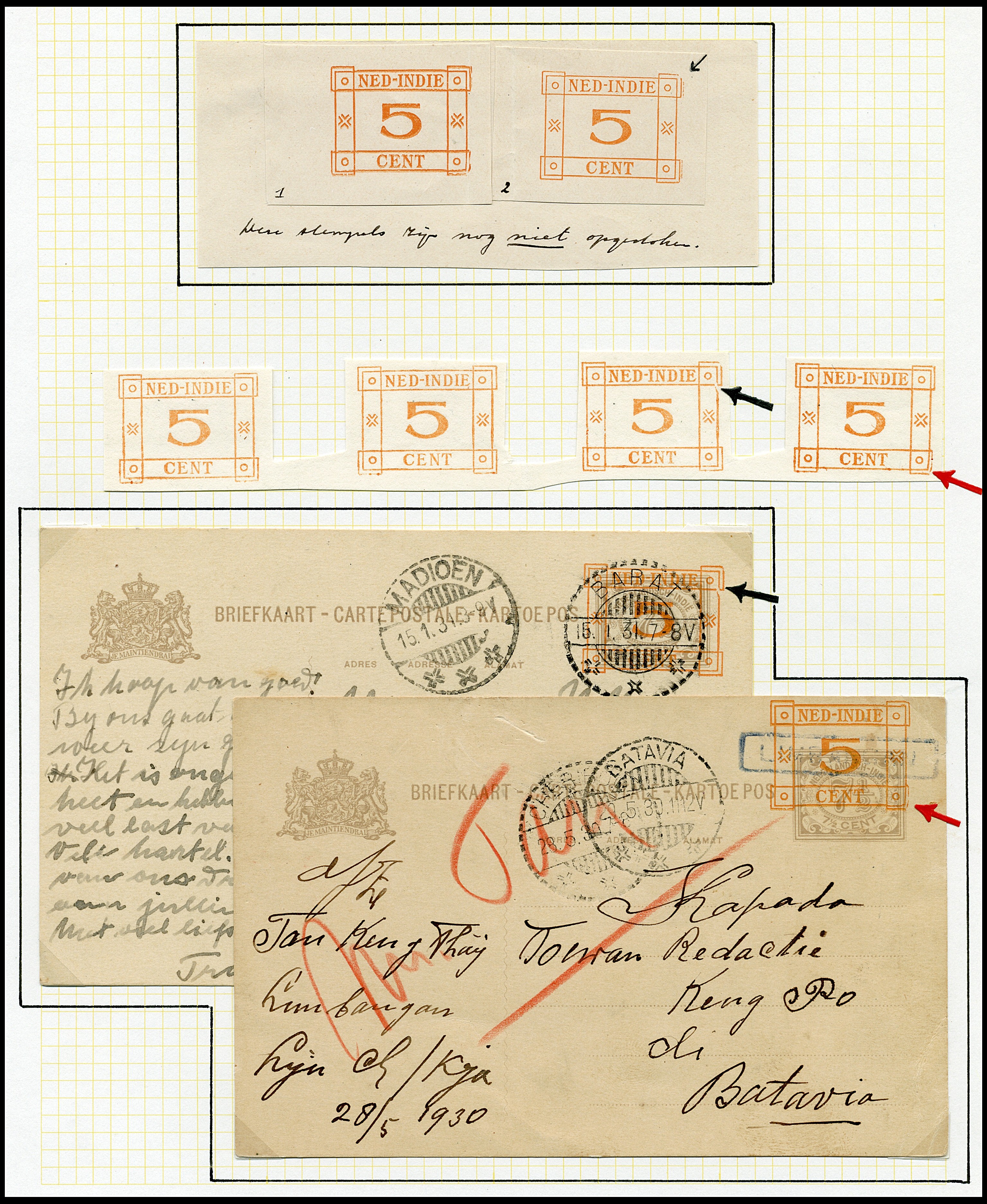 Proefdrukken voor de opdruk ´NED-INDIE 5 CENT´ voor briefkaarten G44/47 (met de pen: ´Deze stempels zijn nog niet opgestoken´) op stukjes papier, tevens met enkele opdrukfoutjes die ook voorkomen in de gebruikte opdruk, te zien op bijgevoegde bk. G44 uit Barat 15-1-1931 resp. uit de halte Limbangan van 28-5-1930