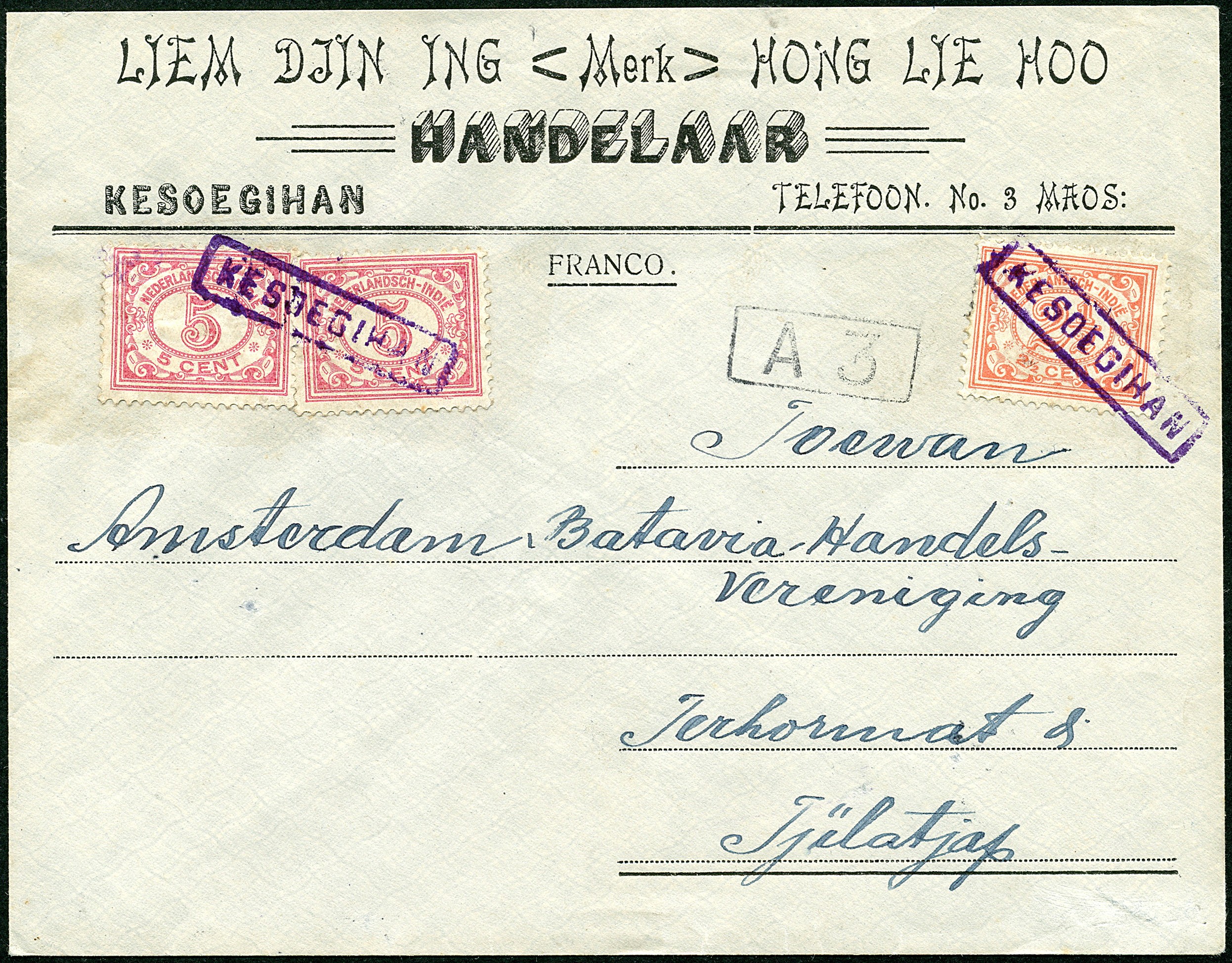 Halte. Prachtige firma-env. gefr. met 2½c en 2x 5c 2x in paars afgest. met haltestempel KESOEGIHAN naar Tjilatjap 21-8-1922