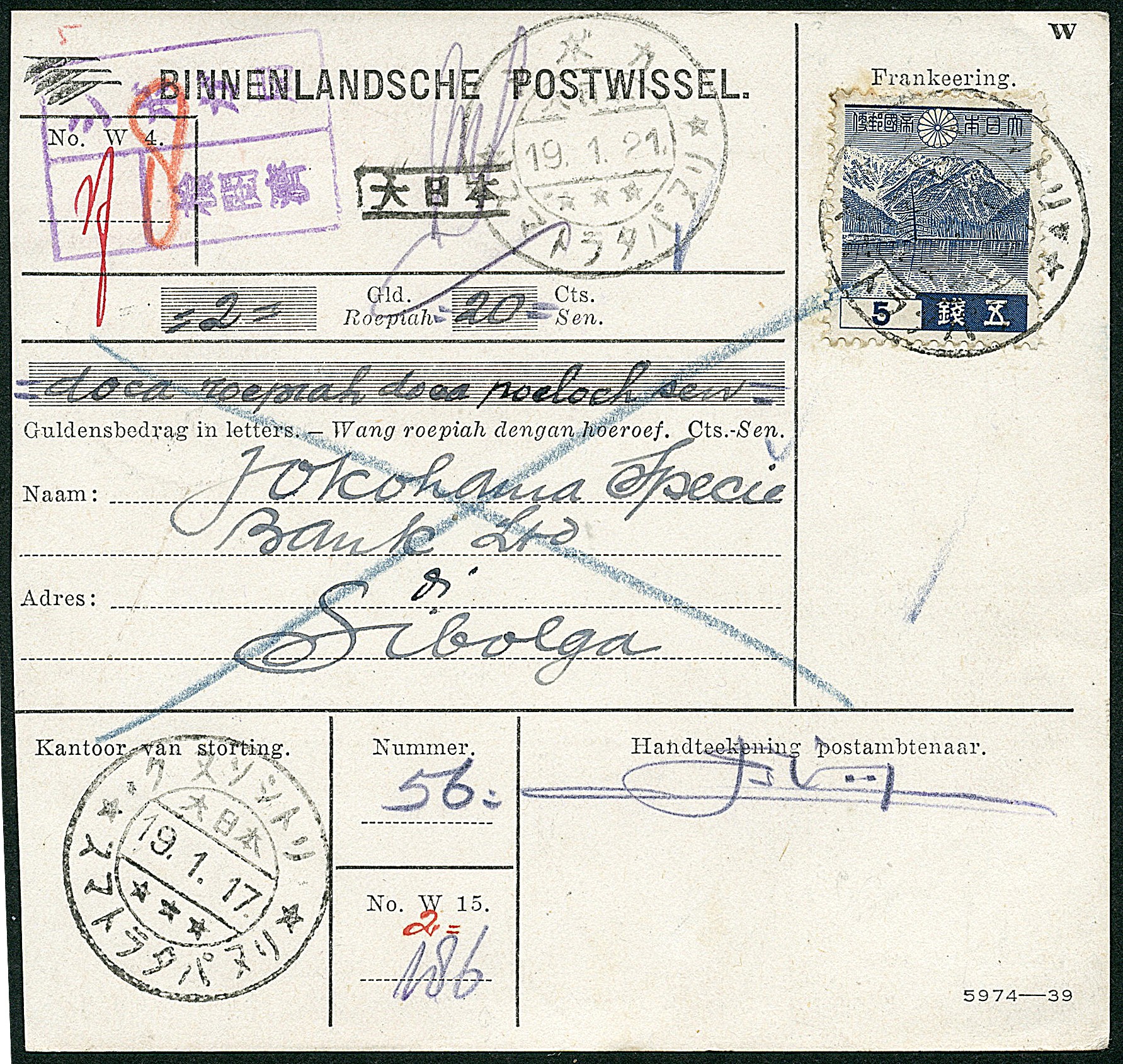 Sumatra. Tapanoeli. 5 Sen Japanese stamp (1st Showa series) as a single franking on censored money order Bu.JF1a with black framed Dai Ni Hon overprint from Goenoengsitoli 19.1.17 to Siboga 19.1.21