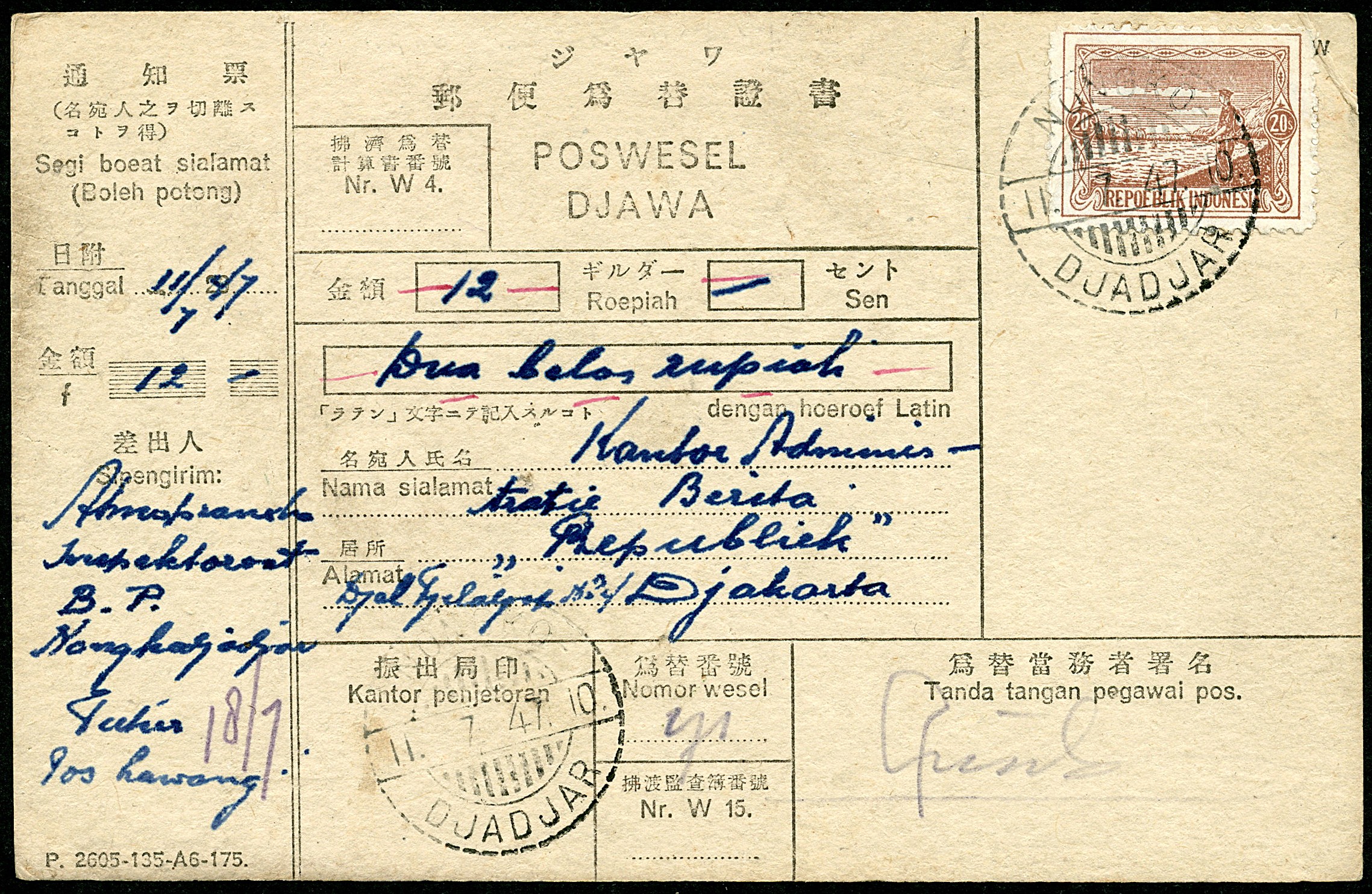 20 Sen 1st definitive series on complete money order Bu.RF3a from Nongko-/Djadjar 11.7.47.10 to Djakarta 17.7.47 (backstamped roller cancel)