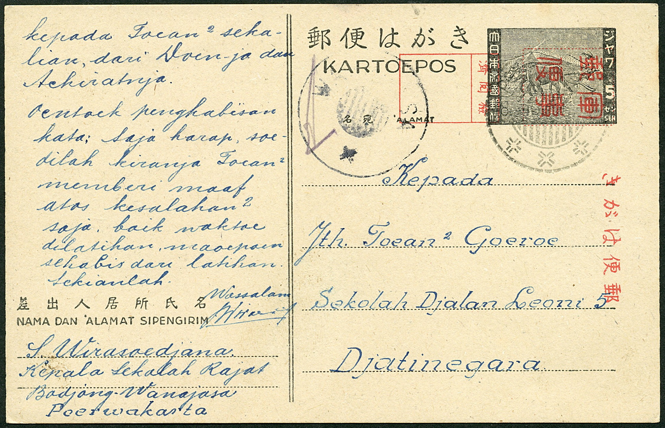 Delivery house pmk WANAJASA in blackish blue on postcard Bu.RJ.N6 (crease) via Poerwakarta 18.10.45 to Djatinegara. Faint strike but not listed and so far the only example known to us