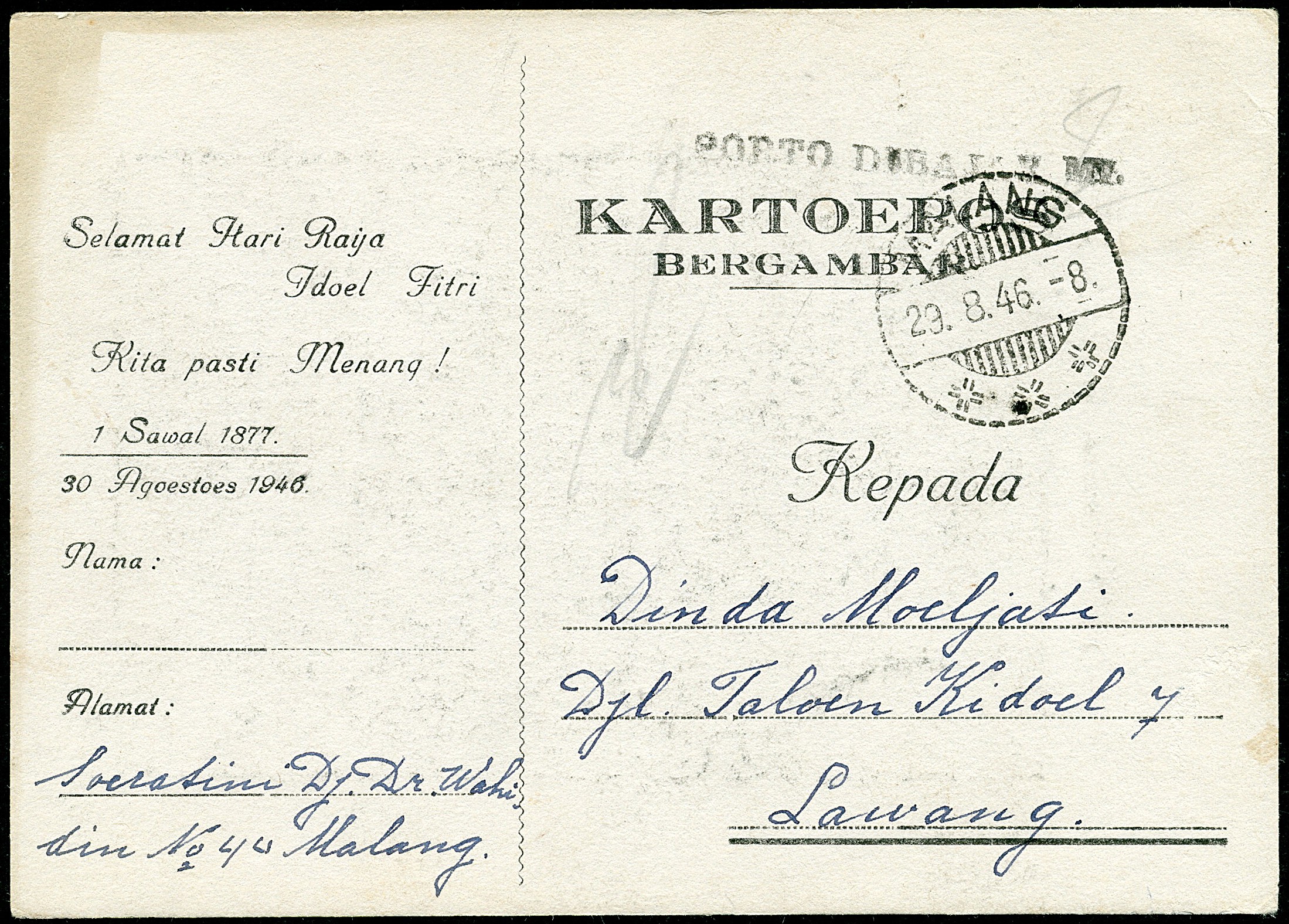 Kartoepos Bergambar (= illustrated postcard with on the reverse a printed sketch with text ´Berontak teroes...´ = keep on rebelling) with handstamp PORTO DIBAJAR ML, from Malang 29.8.46 to Lawang. This card fits wonderful in a collection of the Revolution period