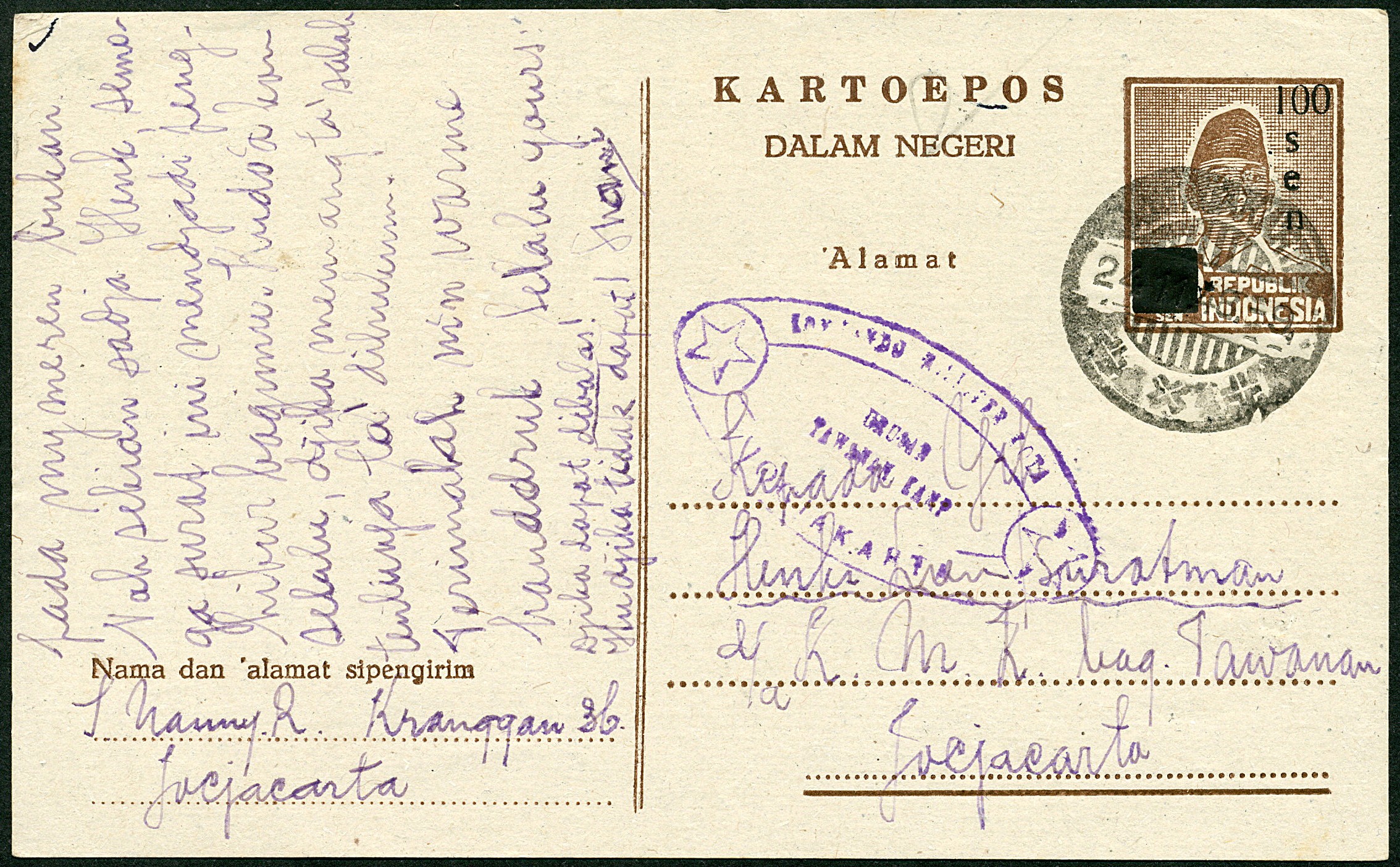Postcard Bu.RJ26 from Djokjakarta 24.11.48.-9. to a prisoner, showing violet oval cachet ´KOMMANDO MILLITER KOTA / URUSAN / TAWANAN KAMP / JOGJAKARTA´. In Djokjakarta was a Republican internee camp for those who participated in the communist insurgency of Madioen in September 1948. A rare and historical card in wonderful quality