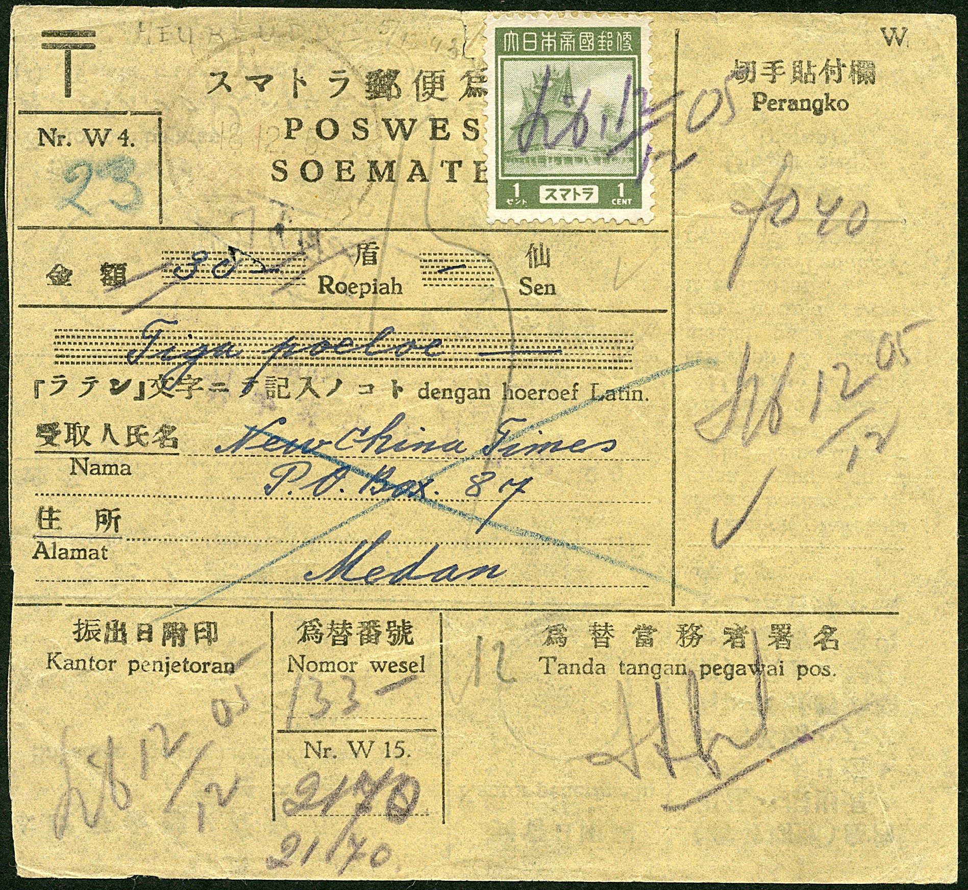 Written postage ´f 0 40´ and 1 cent definitive issue (= additional form price) on thin, yellow money order Bu.RF32 from Meureudoe 18.12.5 to Medan 20.12.21. Japanese postmarks with showa date