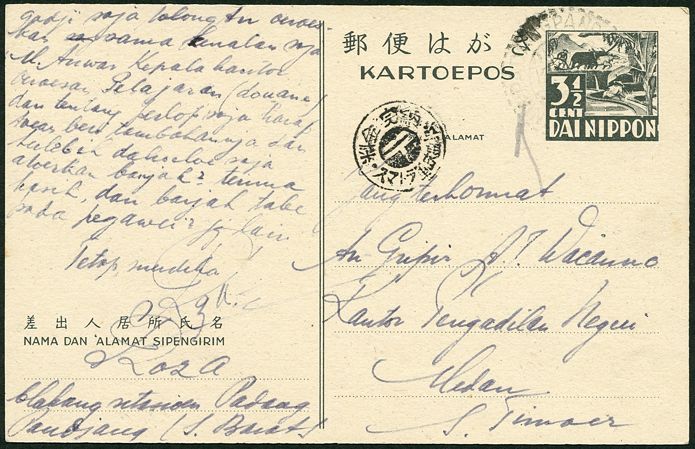 3½ cent Postcard type Kreisler with black validity handstamp T (= 7 sen) KPI.SK-5 from Padang-Pandjang 11.3.46 to Medan