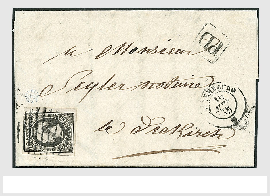 LUXEMBURG, 10 c. black no.1, very fine example cancelled with a 9-line cancel from Luxemburg 16/6/1855 to Diekirch