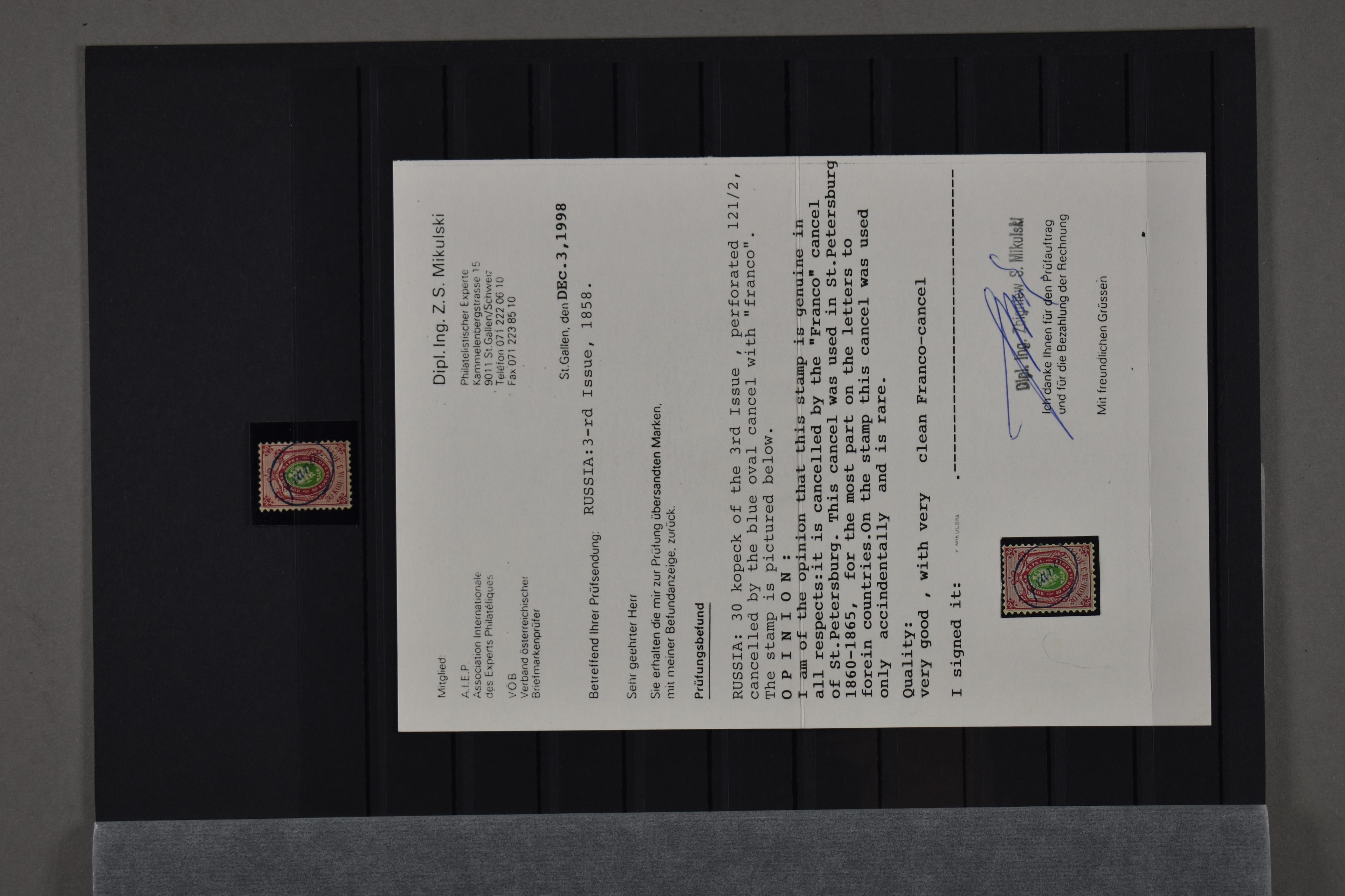 RUSSIA, Mi.7, 30 Kopek III.-issue 1858 perf. 12½, cancelled by the blue oval 'franco' of St. Petersburg, rare cancel on stamp. Superb quality and cert. Mikulski (1998)
