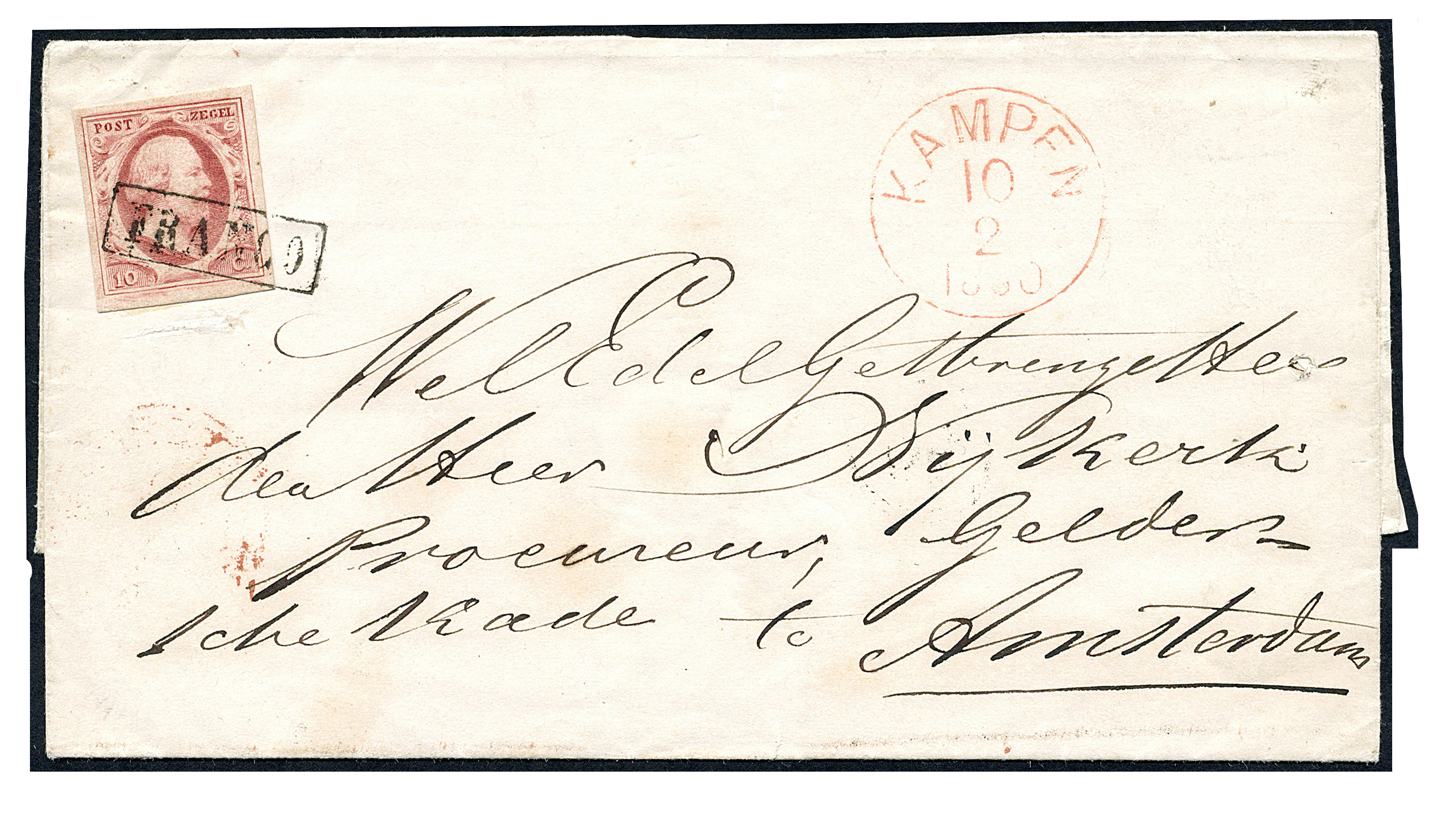 10 Cent nr. 2i-Pl.V-83, vol tot breed gerand prachtex. op frisse briefomslag van Kampen 10-2-1860 naar Amsterdam 11-2-1860, met op az. tevens bestellerstempel 25 in cirkel. Kampen beschikte in de periode 1-1-1860 tot 5-3-1860 nog niet over een nieuw halfrond-francostempel, de H/S C type II, en stempelde de zegel daarom met Franco af