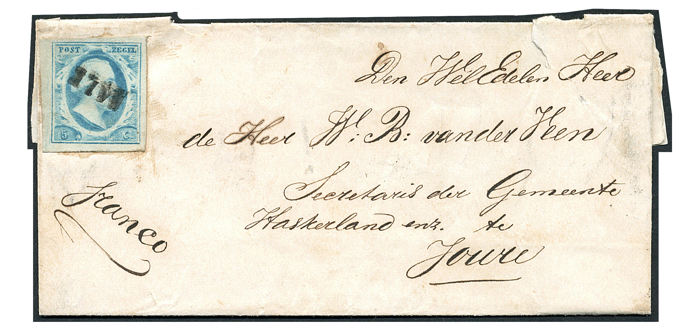 Naamstempel BALK in zwart (EY.125) op 5 cent. Breed gerand prachtex. op wat ruw geopende, ongedateerde briefomslag met op de az. als aankomststempel naamstempel DE JOURE