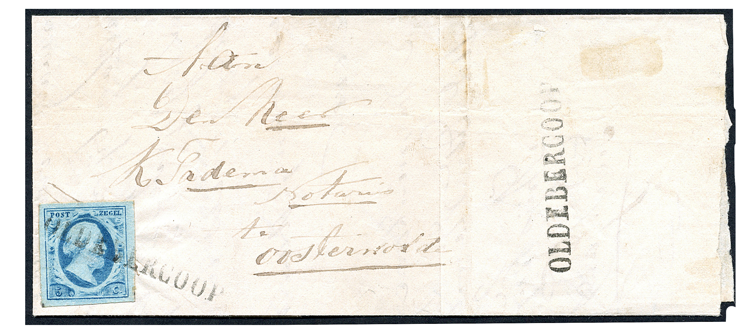 Naamstempel OLDEBERCOOP (EY.100 op losse zegel) op 5 cent nr. 1r-Pl.VI. Zeer breed gerande prachtzegel met mooie afst. (tevens op az.) op frisse brief geschreven te Nijeberkoop 30-3-1864, naar de bekende notaris te Oosterwolde