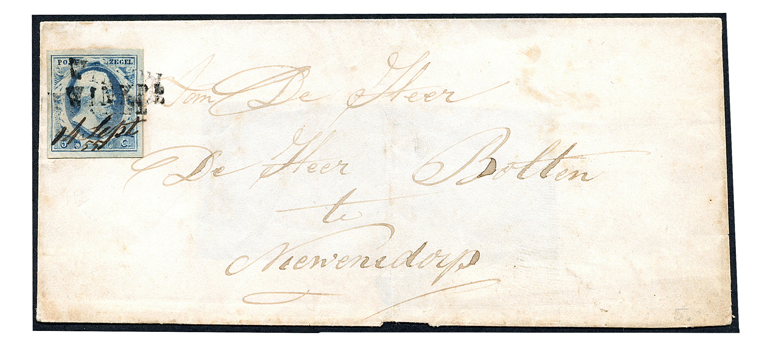 Naamstempel WINKEL (EY.R op losse zegel) op 5 cent nr. 1d-Pl.II-67. Prachtex. met twee afst. waaronder, tegen de voorschriften, met pen geschreven datum '14 Sept 55' op vrijwel volledige briefomslag naar Niewenedorp (= Nieuwe Niedorp)