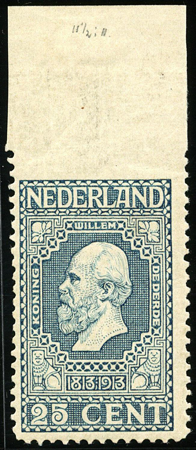96Av, 25 cent Jubileum 1913, Lt. 11½ x 11, met variëteit 'Bovenzijde ongeperforeerd', ongebruikt prachtex. Cert. Vleeming (2024). € 1925