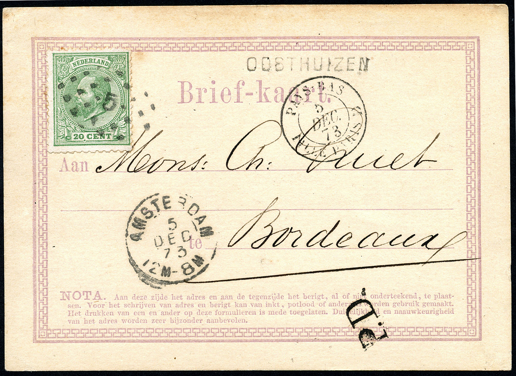 Briefkaartformulier GI gefr. met 20 cent in kamtanding 11½ : 12 kl.g. nr. 24E van OOSTHUIZEN (naamstempel) via Amsterdam 5-12-1873 en het traject Lille-Paris 5-12 naar Bordeaux 7-12, met tevens 'P.D.' Zeldzame kaart, tarief naar Frankrijk 20 cent tot 1-1-1876. Zeldzame kaart!