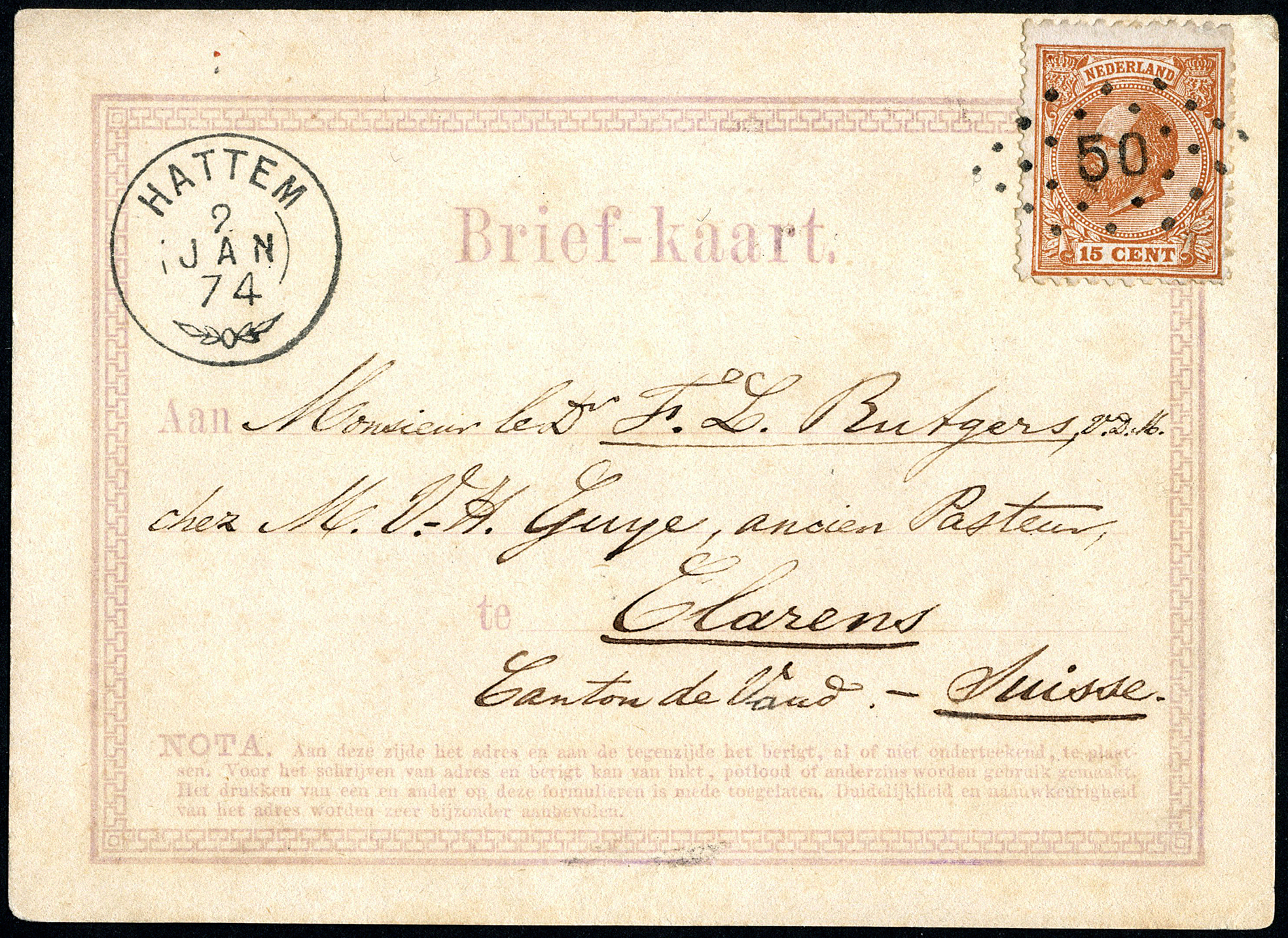 Briefkaartformulier GI gefr. met 15 cent nr. 23C (prachtex.) met superbe afst. 50 en links takjestempel Hattem 2-1-1874 naar Clarens, Zwitserland. Tarief naar Zwitserland tot 1-7-1875 is 15 cent. Uiterst zeldzaam poststuk, mogelijk uniek en in luxe kwaliteit!