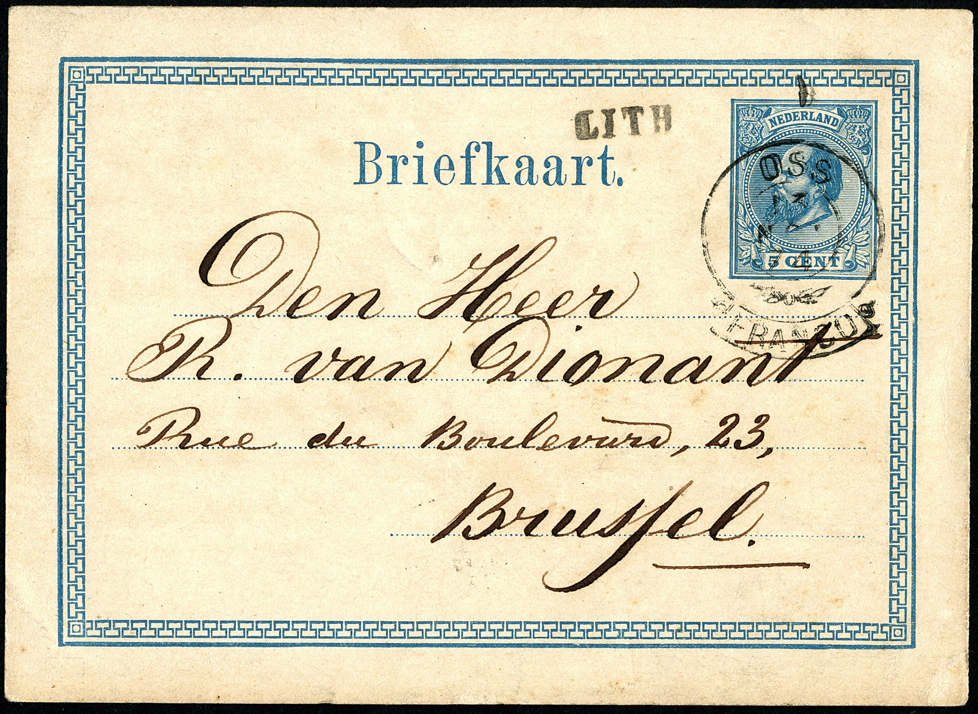 Briefkaarten G5 en G10 tegen de voorschriften afgest. met franco-takjestempels, G5 van Lith (naamstempel) via Oss 13-11-1874 naar Brussel 15-11 en G10 van Vlaardingen 12-7(-1877) naar Königshofen 13-7-1877