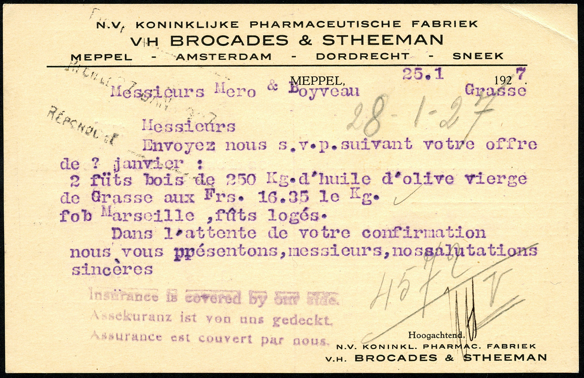 Particulier bedrukte bk. Huygens DR9b (linksboven miniem hoekvouwtje), bijgefrankeerd met 2½ cent met firmaperforatie B&S (van de B ontbreken enige gaatjes, zie Cat. perfins NOR, p.46), van Meppel 23-1-1927 naar Grasse, Frankrijk. Echt, zakelijk gebruikt!