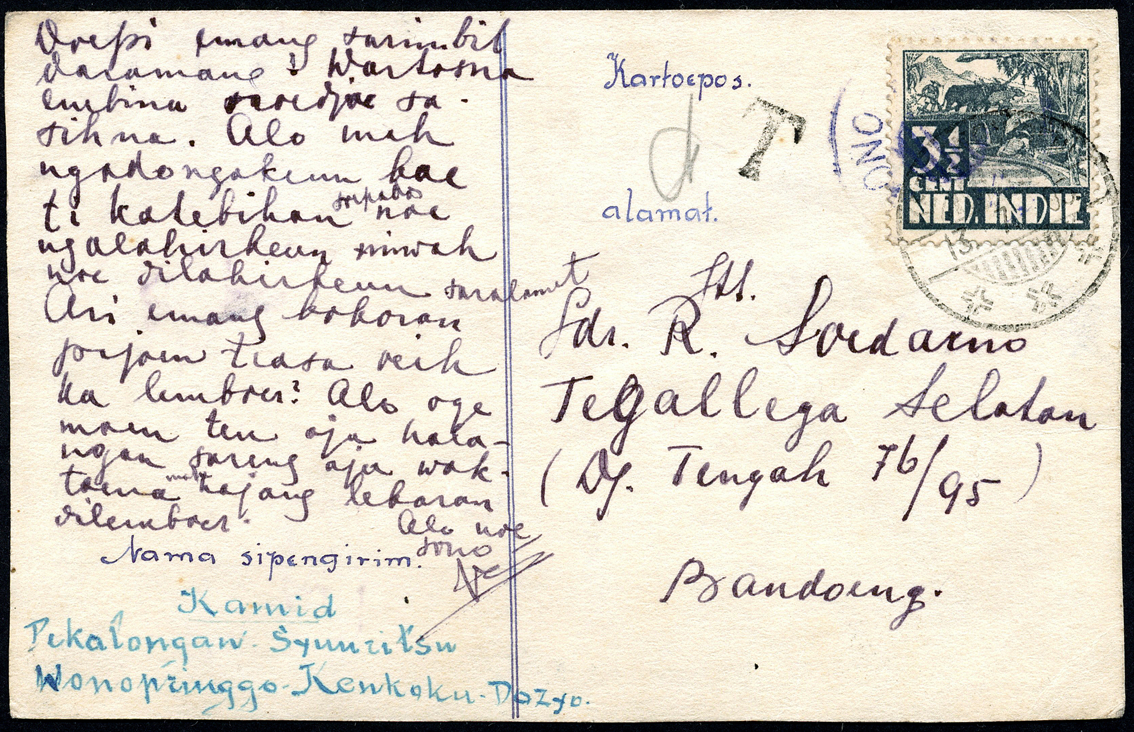 Java. 3½ Cent Kreisler on home-made postcard, written at Wonopringgo 13/7 2605, tied in blue (faint strike) by the extremely rare delivery house pmk WONOPRINGGO (vNV. not listed during the Japanese occupation, RRR during the Revolution period), via Kedoengwoeni 13.7.05 to Bandoeng. Since on 1 July the rate for postcards was increased to 5 cent, a T has been cancelled next to the stamp